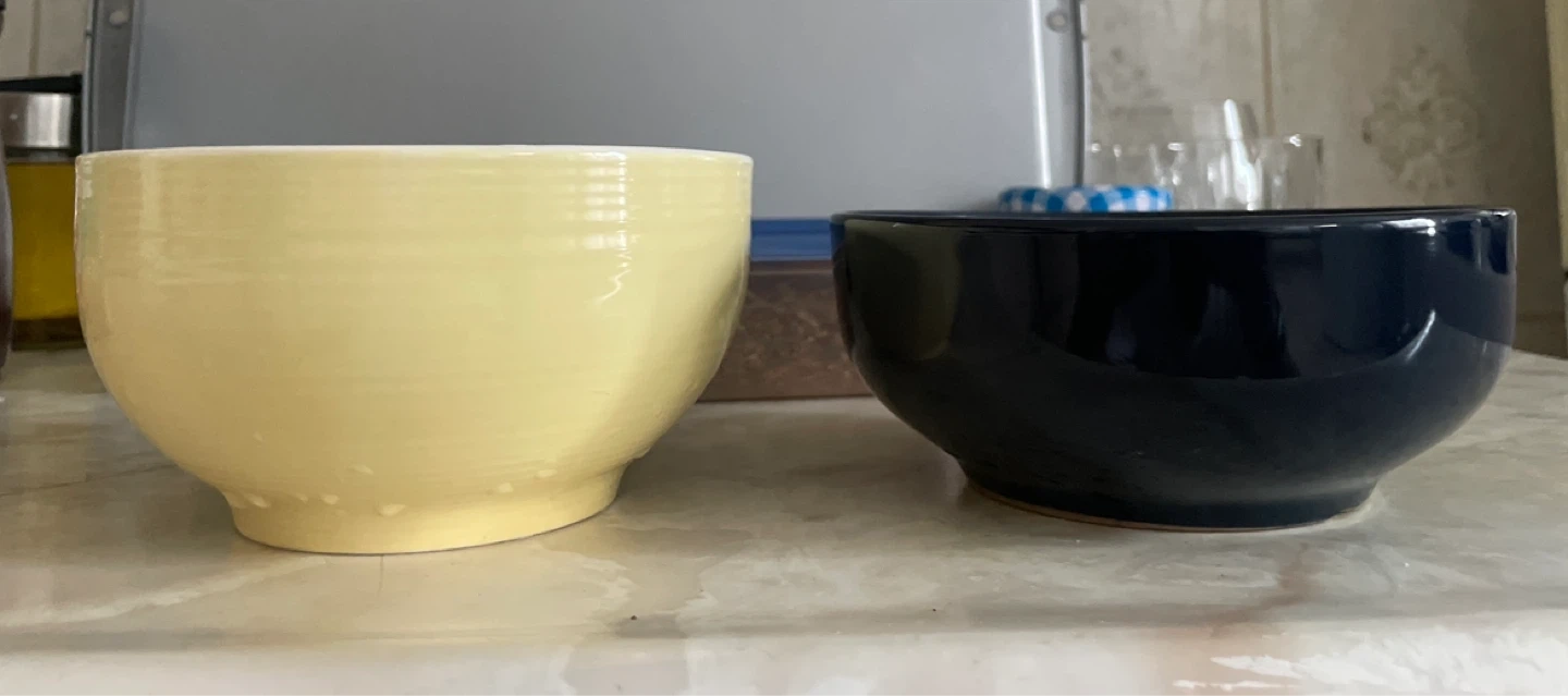 A set of two ceramic bowls, one pale yellow, and one deep blue. Dishwasher and microwave safe. These bowls are great for serving snacks or holding your morning cereal!