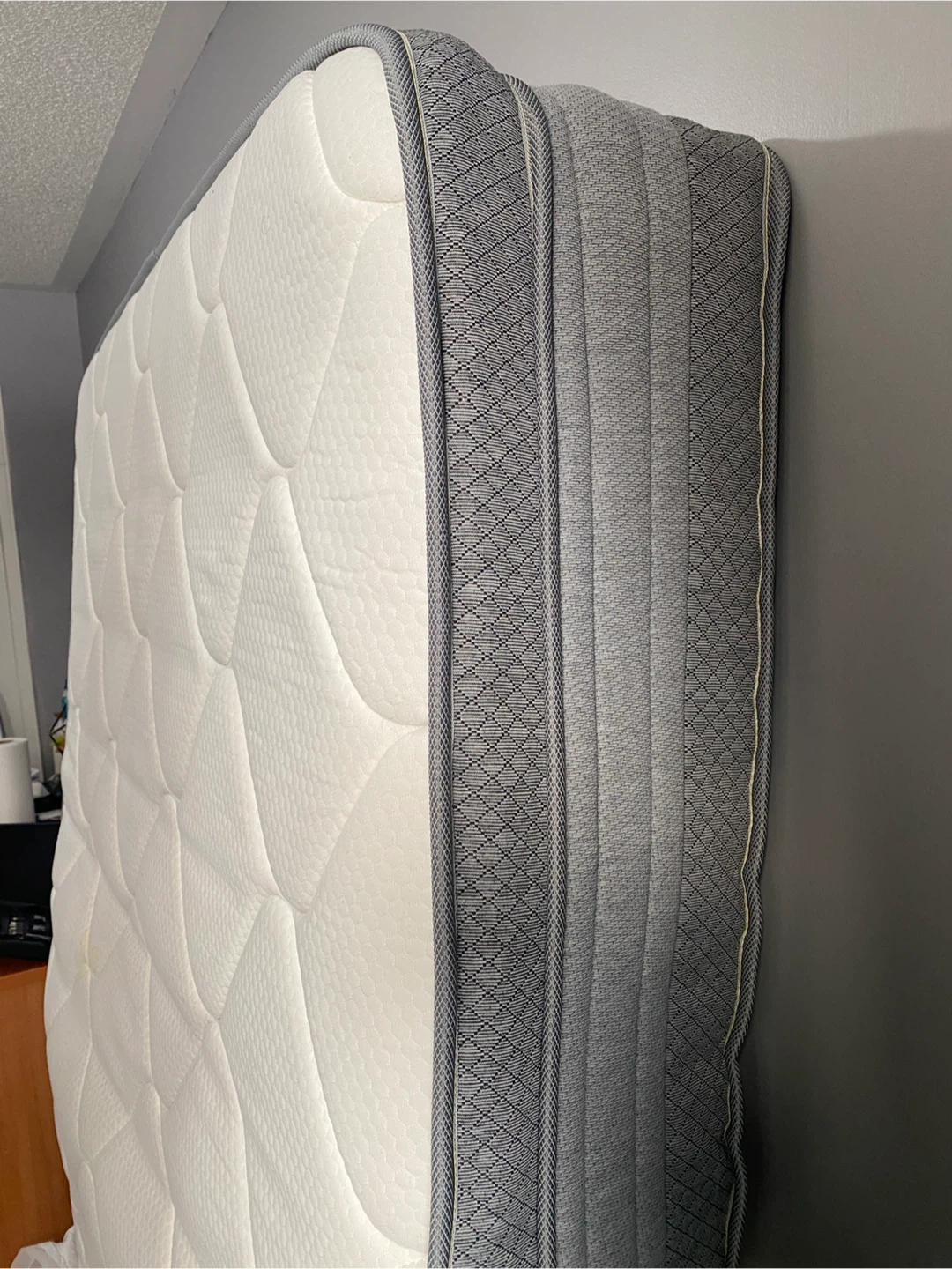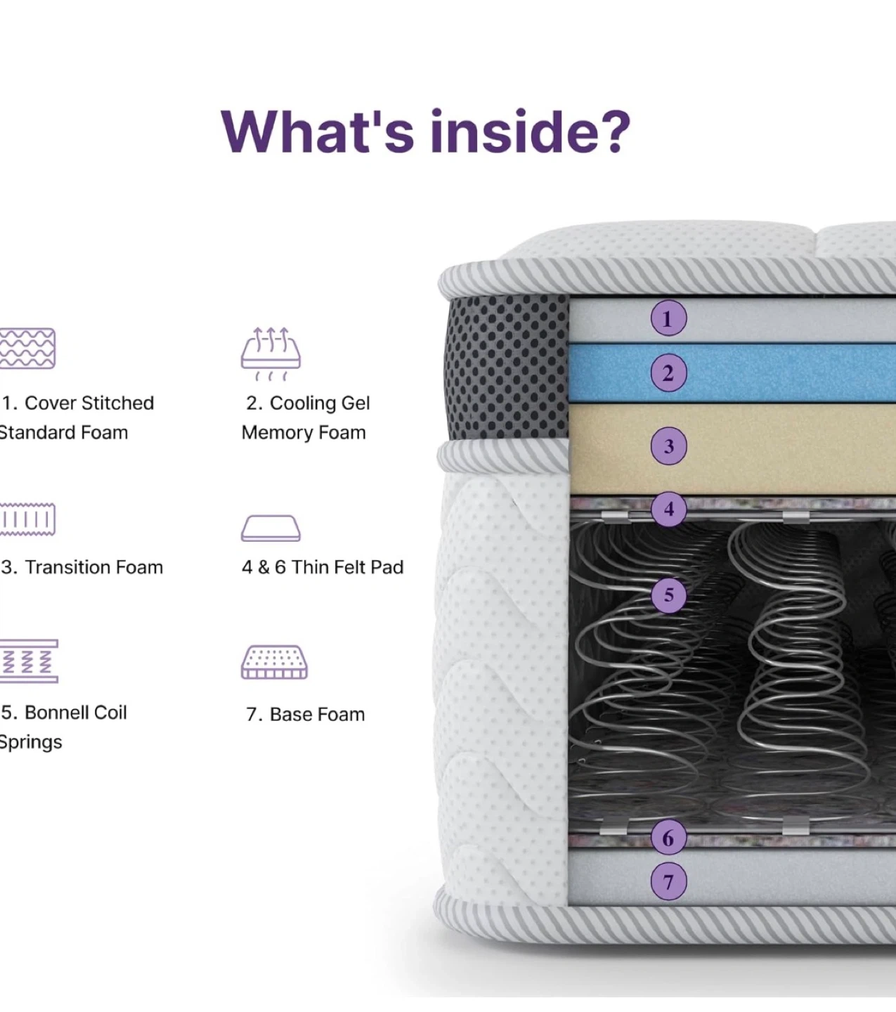 Nap Queen Sleep mattress with a stitched cover, cooling gel memory foam, transition foam, and Bonnell coil springs. It includes base foam and felt pads. This mattress is designed for a comfortable sleep.