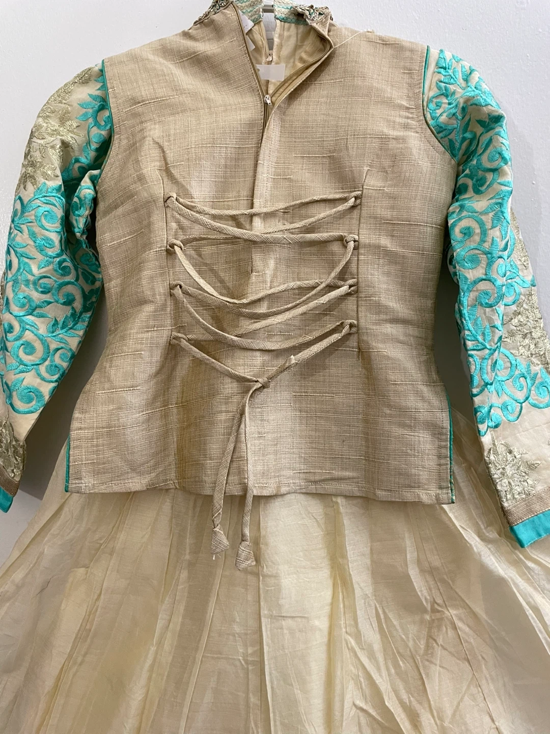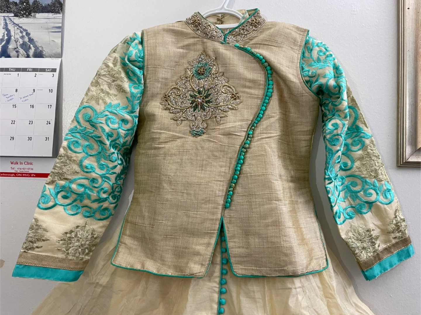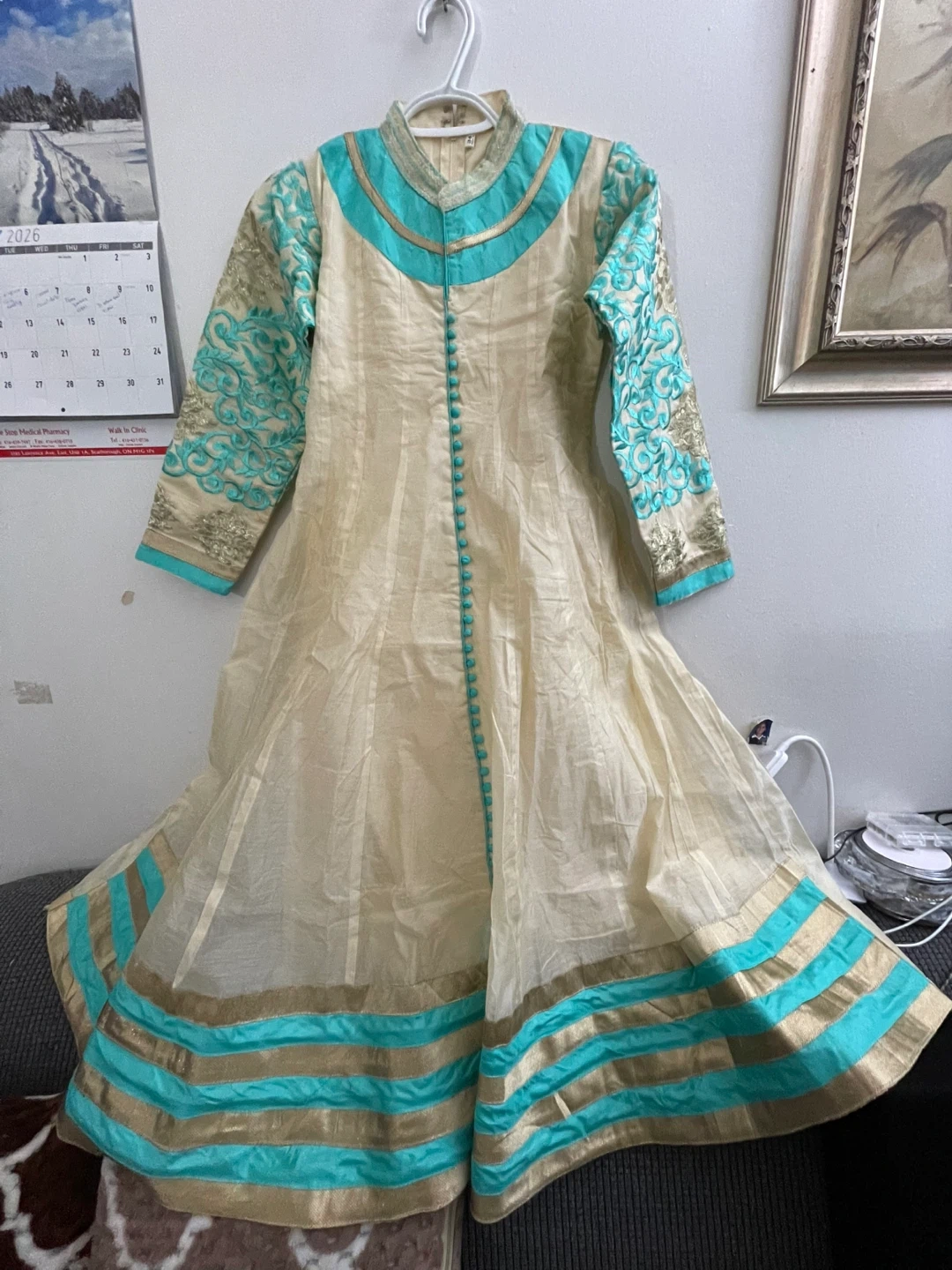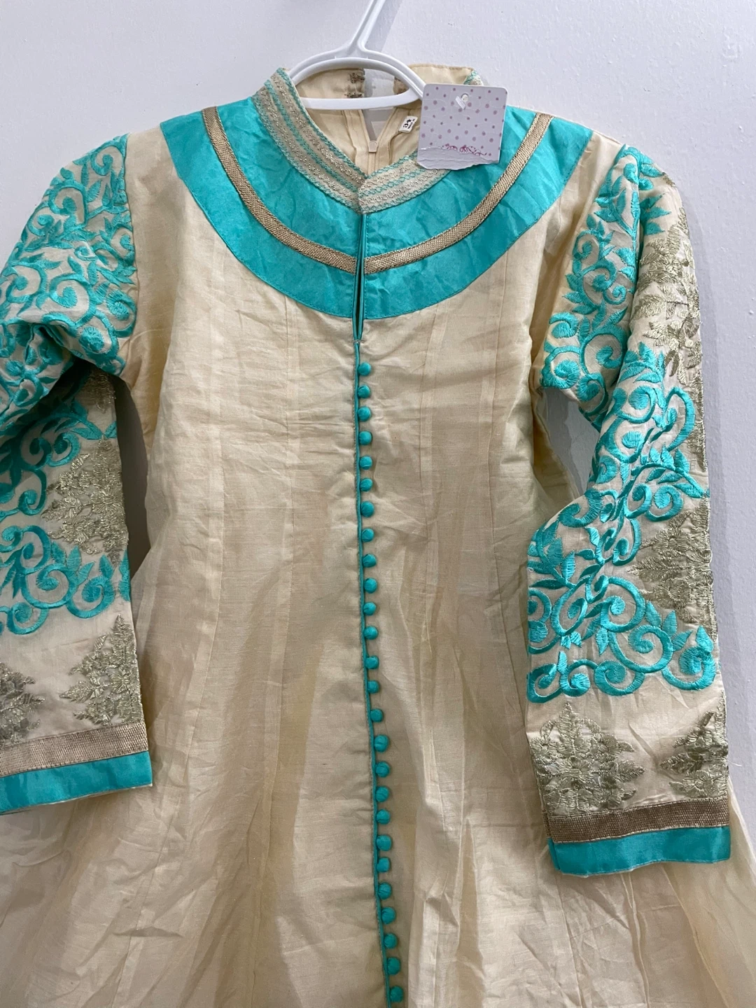 This is a beautiful cream-coloured kurti with turquoise and gold embroidery. It features a mandarin collar, full sleeves, and a decorative button placket. The back has an adjustable lace-up closure for a custom fit. Perfect for festive occasions! Dupiyan silky material with jariand stones works embroidery masakaly dress 2 pieces both are long sleeves one already is attached other ones u Cen wear without or u can attach 34 size brand new with tags $50 together or buy it shepherds $$30 for dress and top koti $30 pick up Markham and Lawrence avenue east no drop off only door pick up.