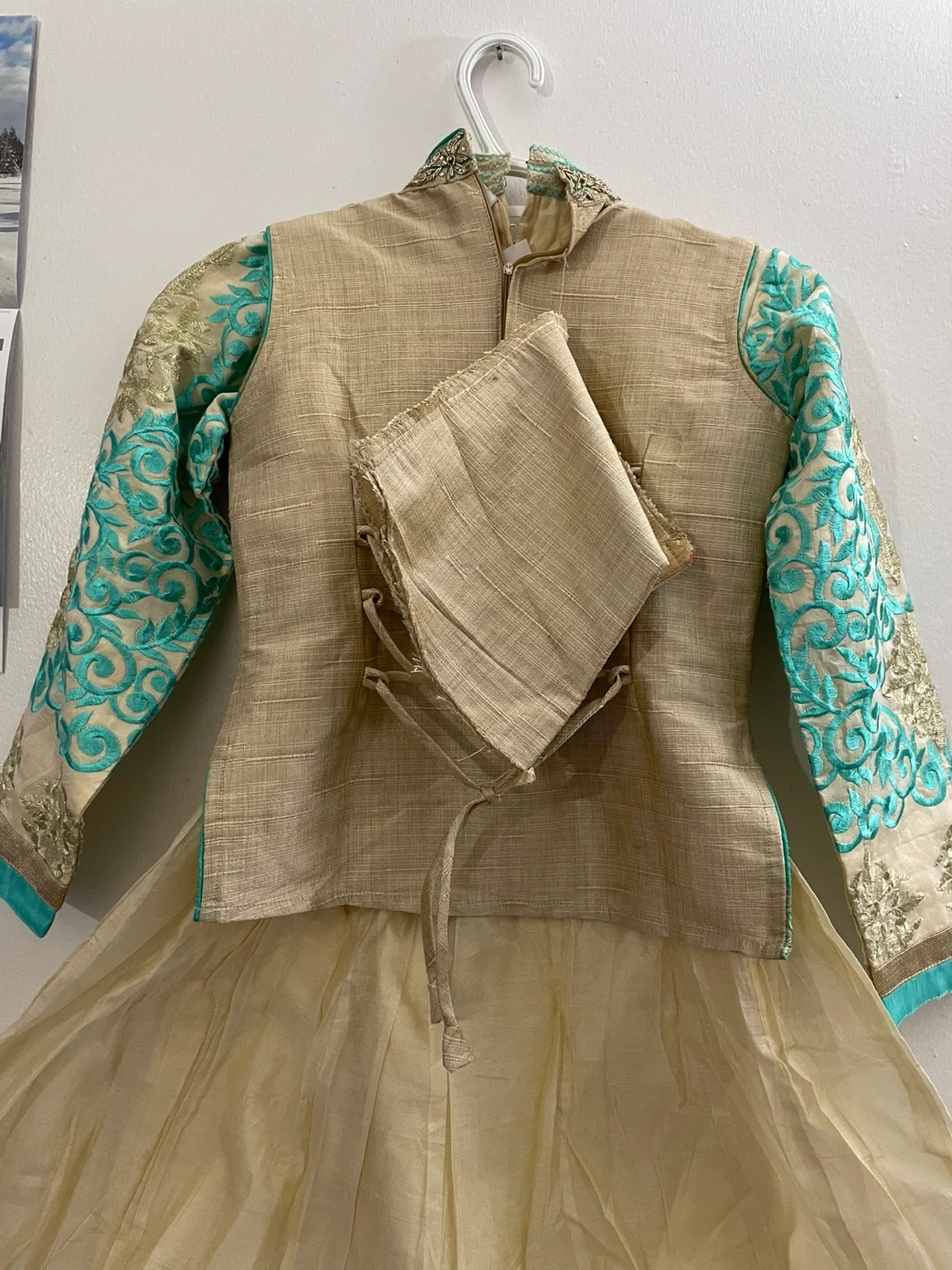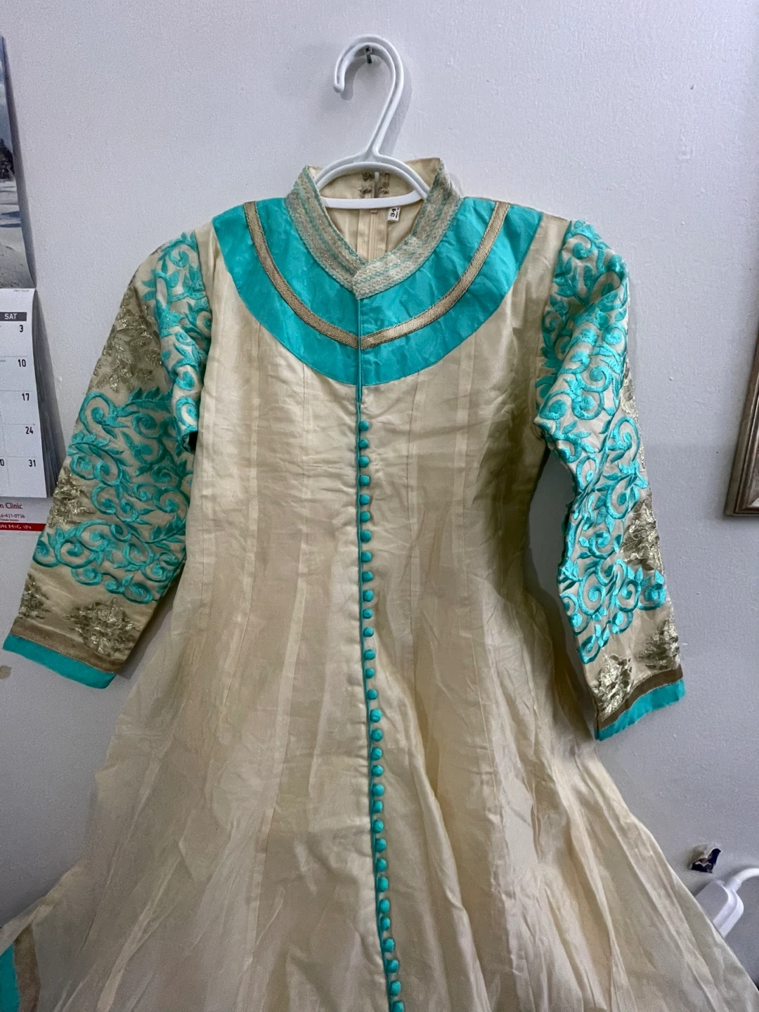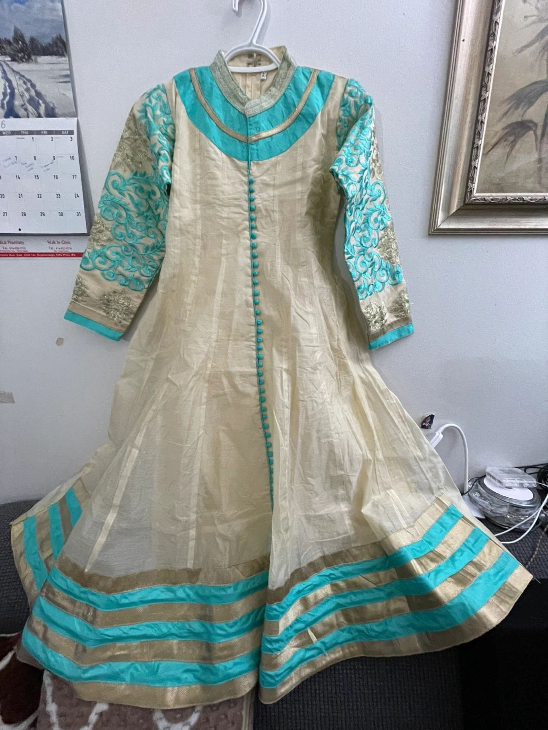 This is a beautiful cream-coloured kurti with turquoise and gold embroidery. It features a mandarin collar, full sleeves, and a decorative button placket. The back has an adjustable lace-up closure for a custom fit. Perfect for festive occasions! Dupiyan silky material with jariand stones works embroidery masakaly dress 2 pieces both are long sleeves one already is attached other ones u Cen wear without or u can attach 34 size brand new with tags $50 together or buy it shepherds $$30 for dress and top koti $30 pick up Markham and Lawrence avenue east no drop off only door pick up.