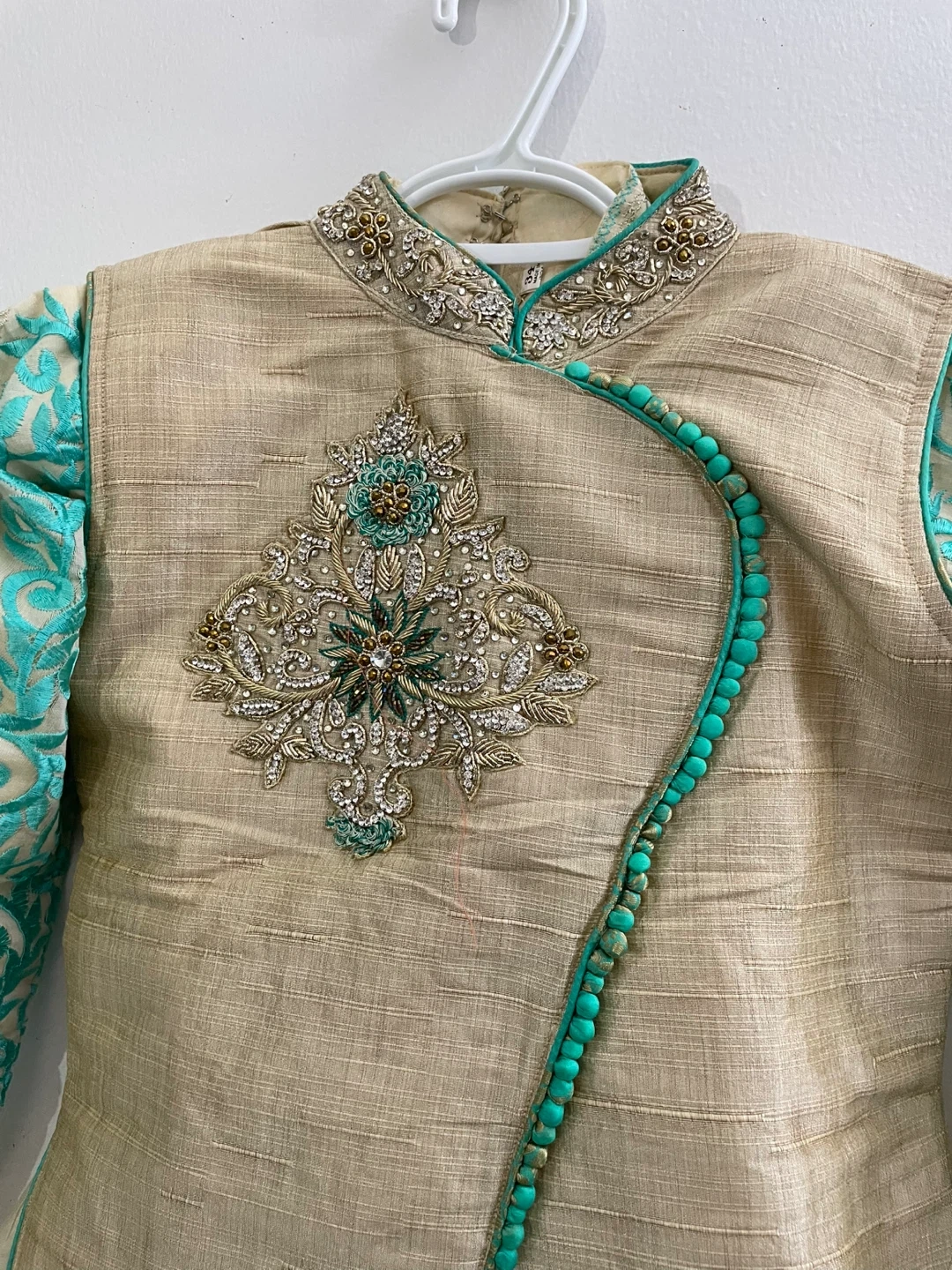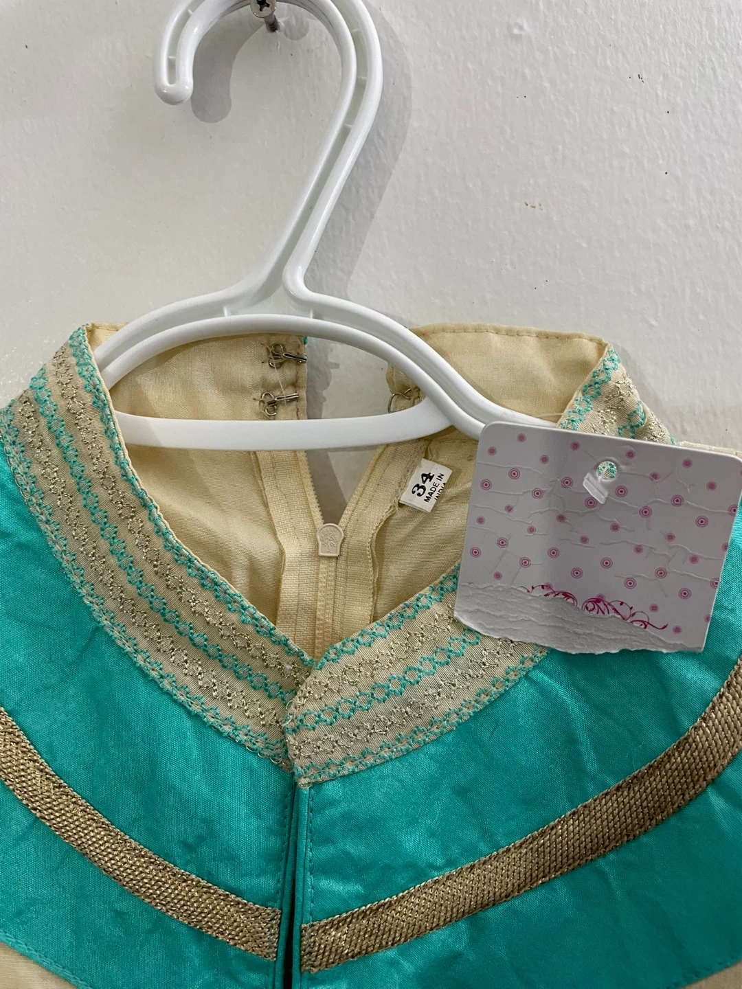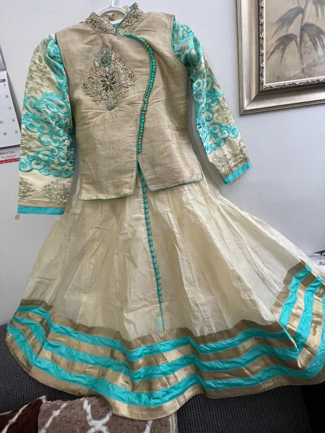 This is a beautiful cream-coloured kurti with turquoise and gold embroidery. It features a mandarin collar, full sleeves, and a decorative button placket. The back has an adjustable lace-up closure for a custom fit. Perfect for festive occasions! Dupiyan silky material with jariand stones works embroidery masakaly dress 2 pieces both are long sleeves one already is attached other ones u Cen wear without or u can attach 34 size brand new with tags $50 together or buy it shepherds $$30 for dress and top koti $30 pick up Markham and Lawrence avenue east no drop off only door pick up.