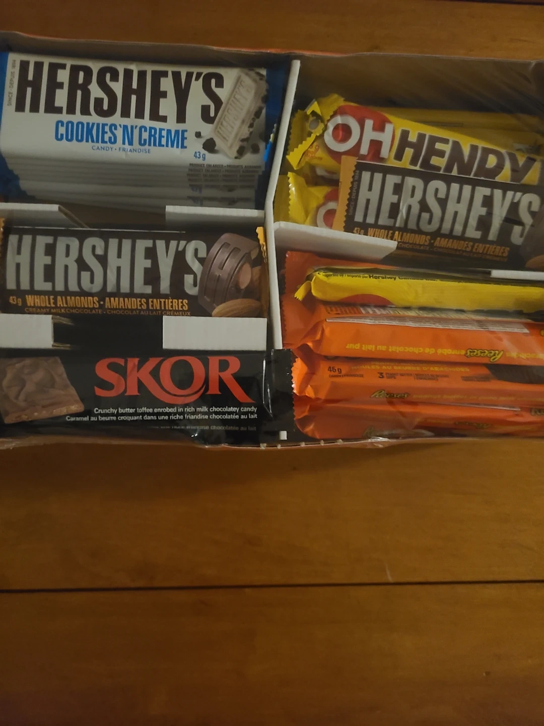 This is a box of 50 assorted full size Hershey's chocolate bars. Includes Reese's Peanut Butter Cups, Oh Henry!, Skor, and Hershey's Cookies 'n' Cream. Manufactured on 2026 March 01.