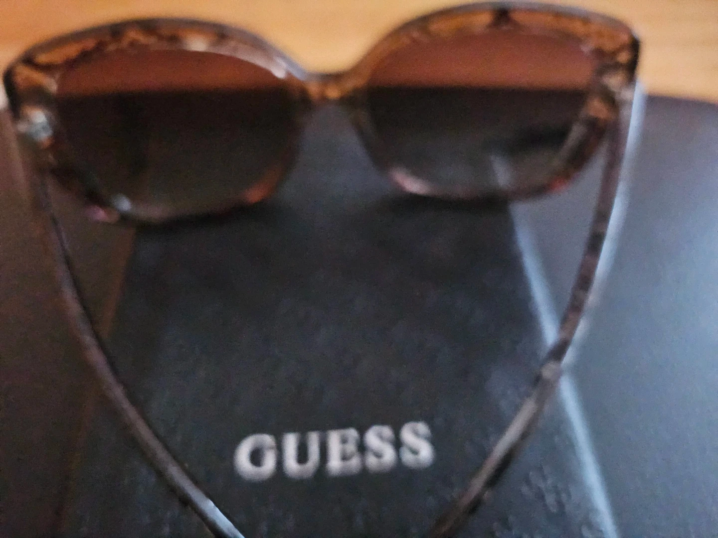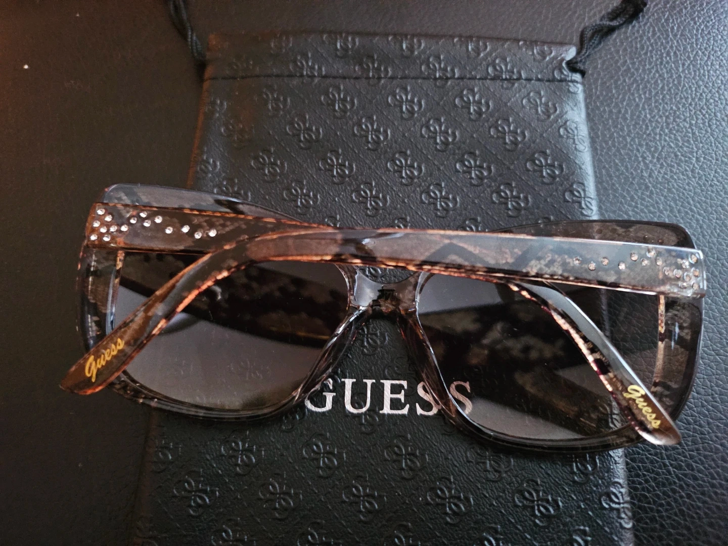 These stylish Guess cat-eye sunglasses feature a brown tortoise shell pattern with decorative rhinestones on the frames. They come with a protective Guess pouch. Perfect for adding a chic touch to any outfit!