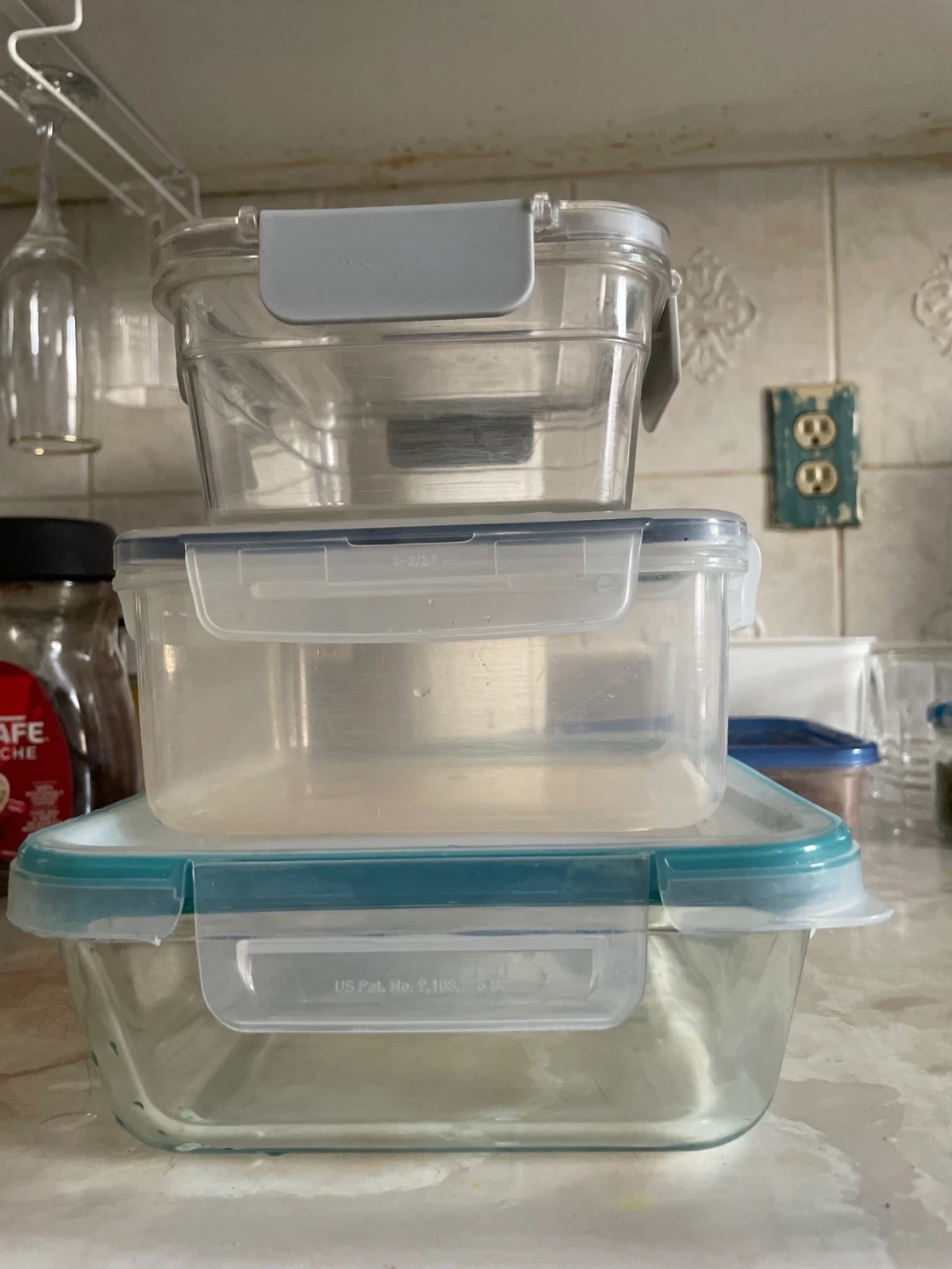 Three food storage containers, two Lock & Lock and one Snapware. They're made of plastic and glass with secure lids. Useful for storing leftovers or packing lunches!