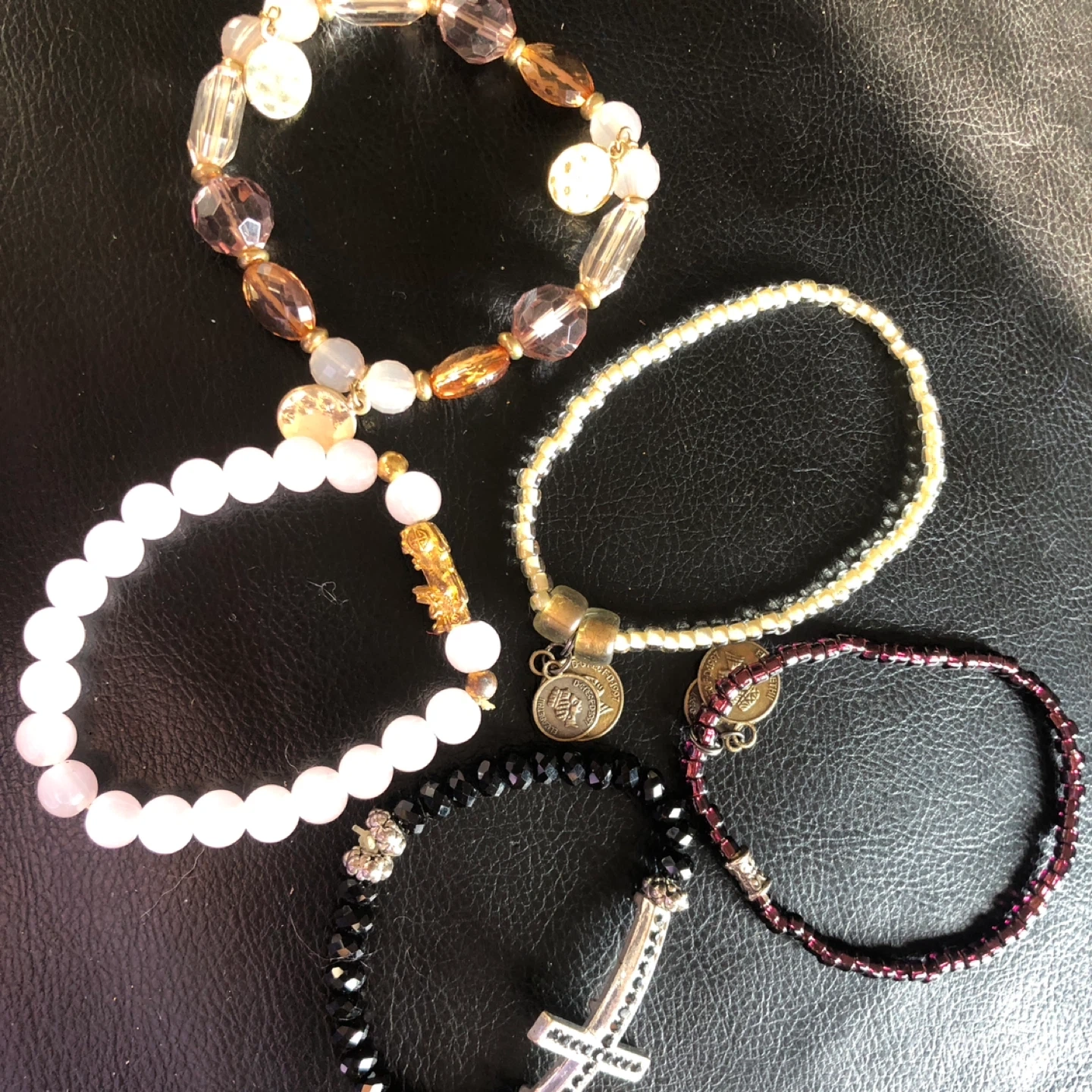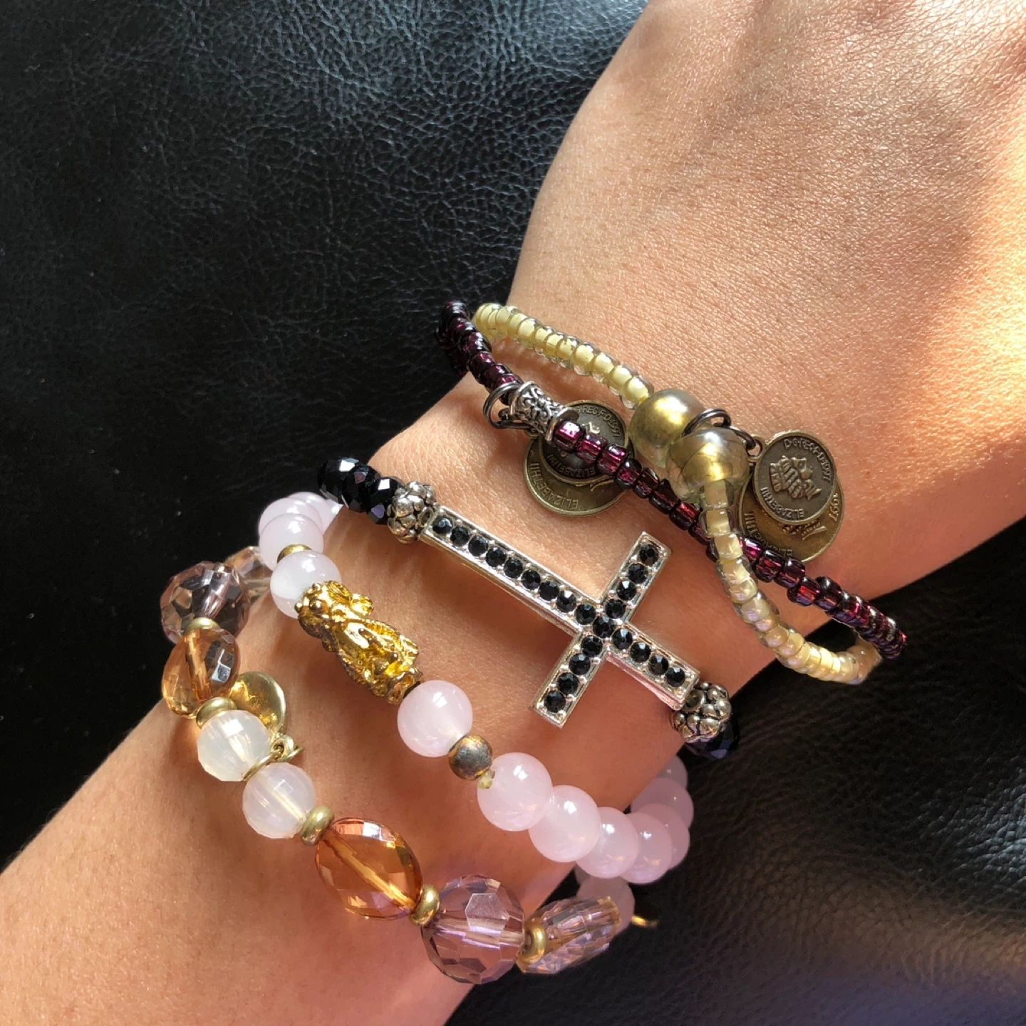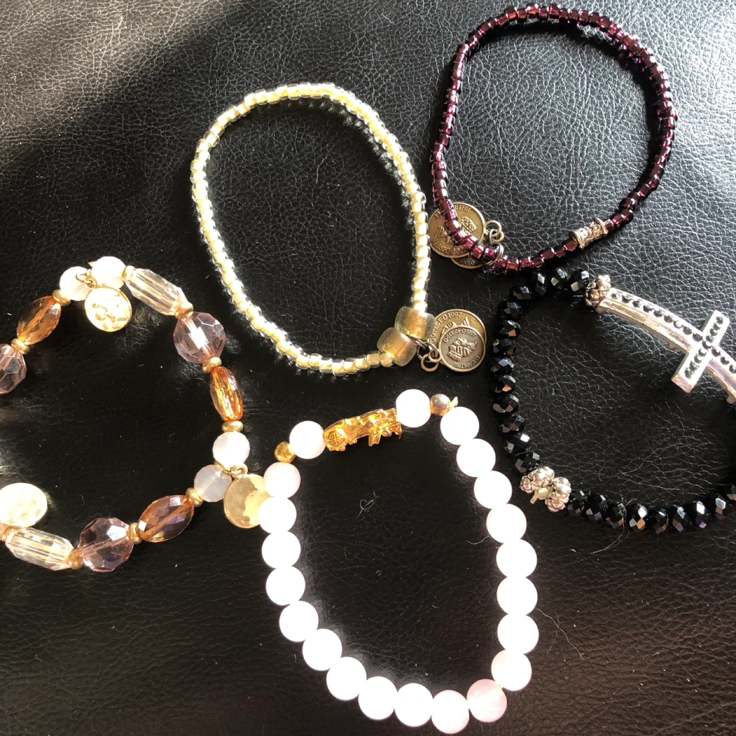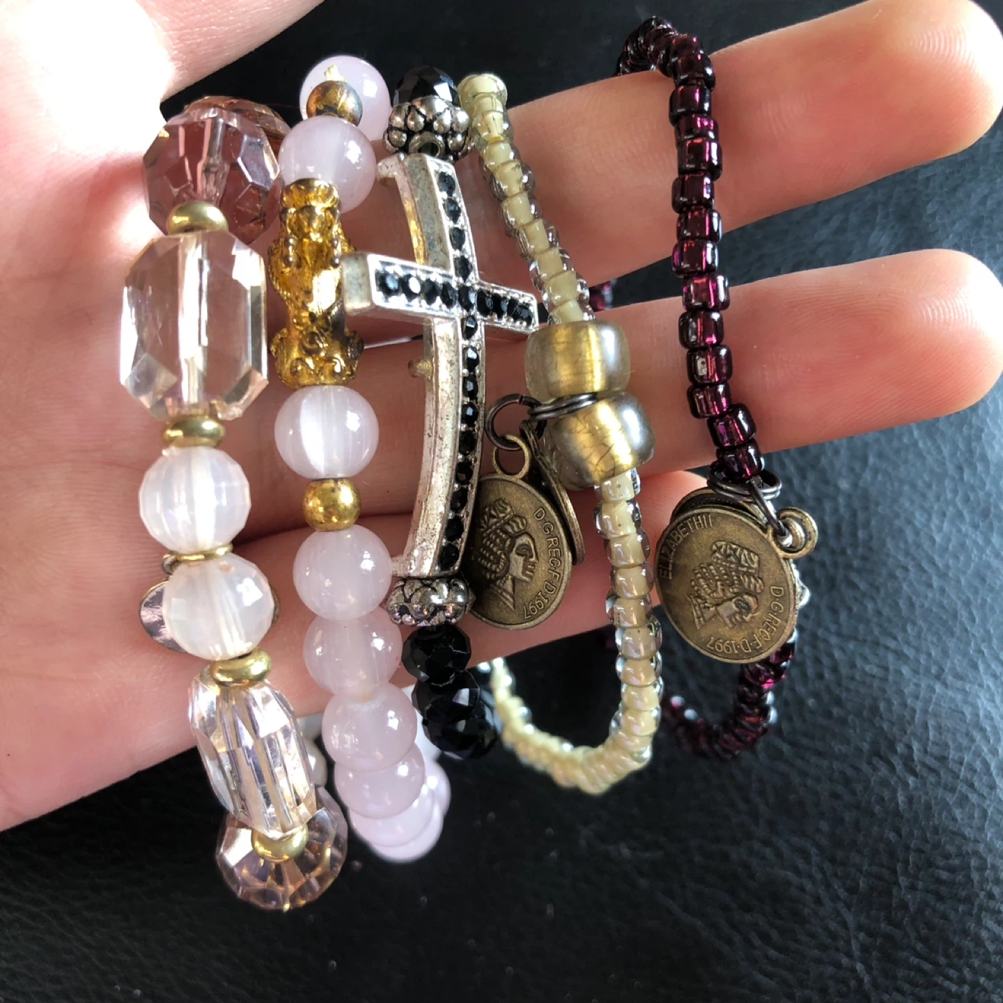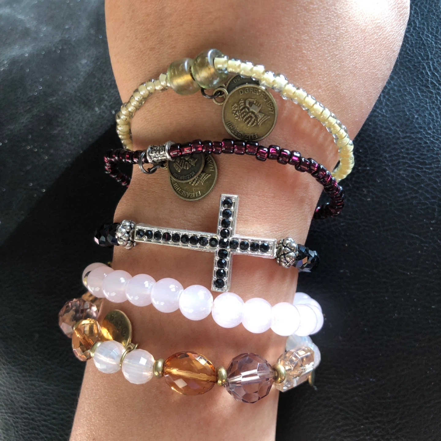 Set includes five unique beaded bracelets. Features include faux pearl, faceted beads, a cross charm with rhinestones, and small coin charms. Mixed materials and colors for a bohemian style.