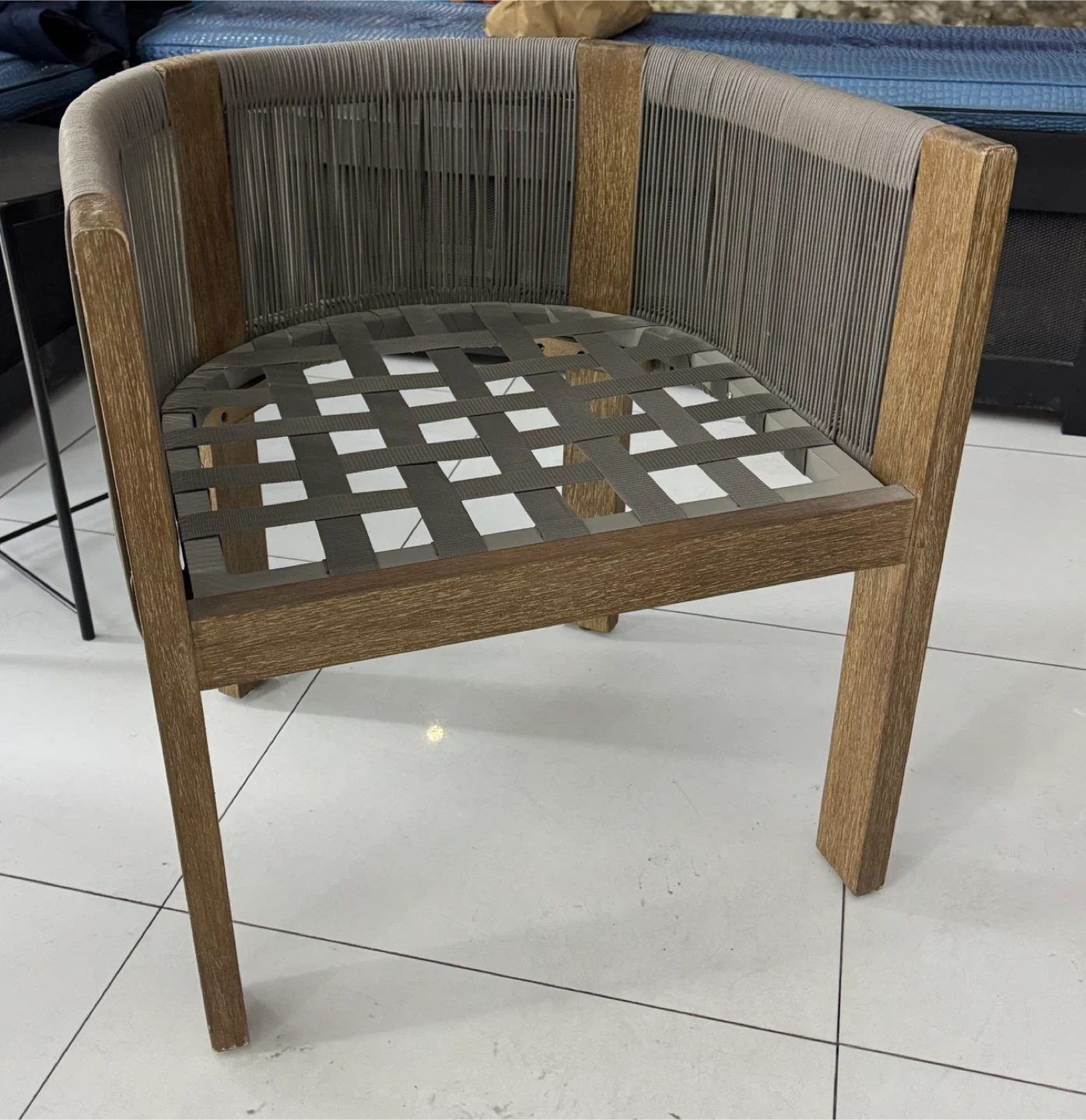 Wooden armchair featuring a woven rope seat and backrest. The frame is made of natural wood with a grey rope detail. It's a modern accent chair for any indoor or outdoor living space.