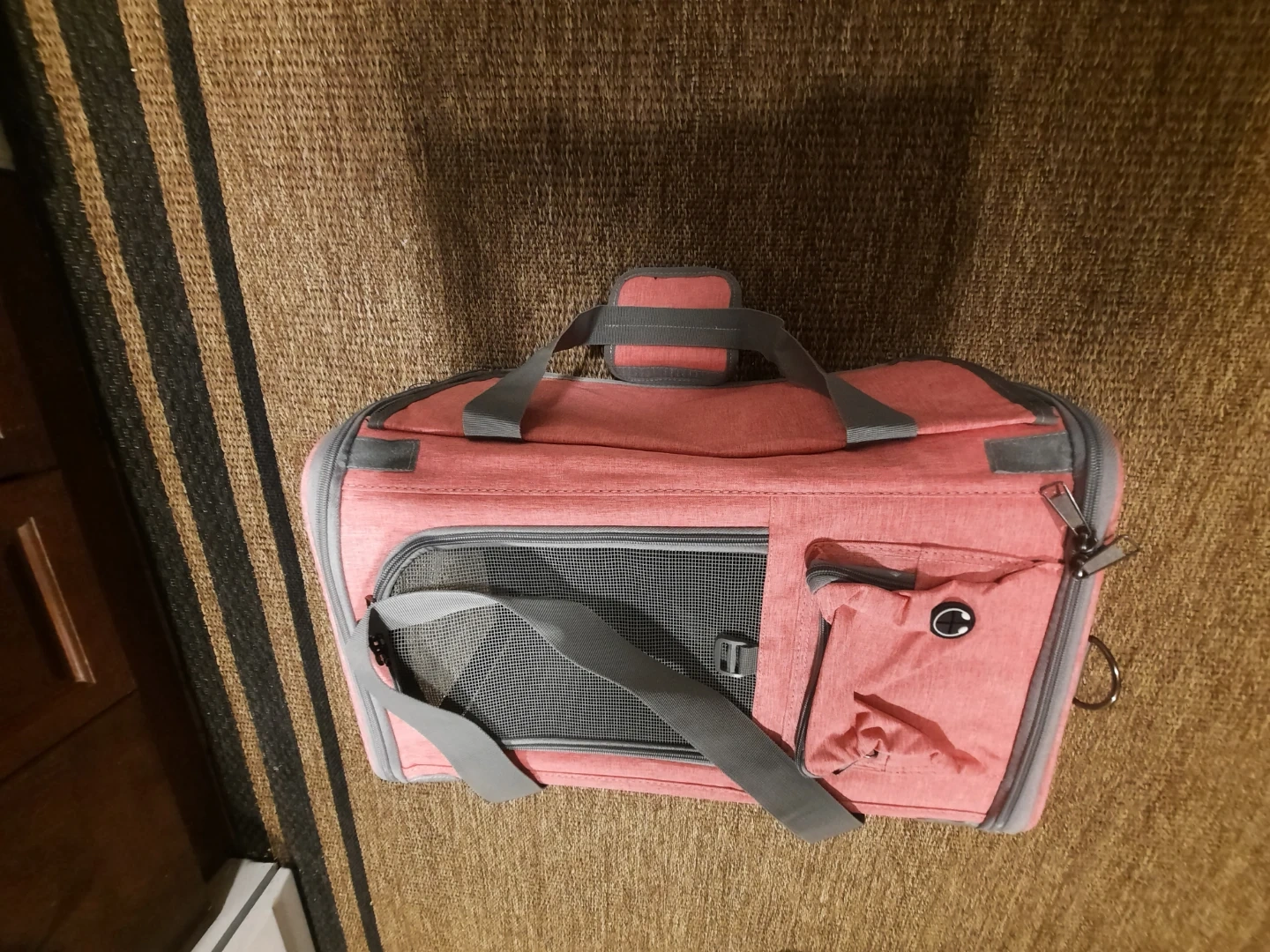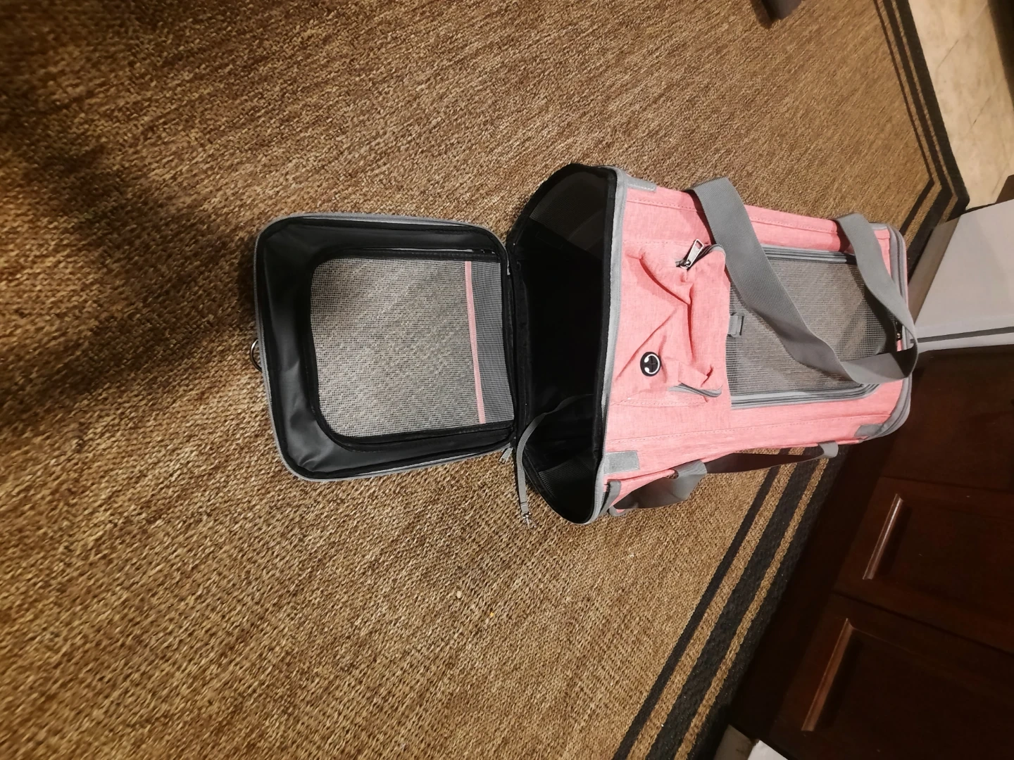 This pet carrier bag is made of durable fabric with mesh ventilation for your pet's comfort. It has a top handle and a shoulder strap for easy carrying. The carrier is pink with grey accents. It's suitable for small to medium-sized pets.
