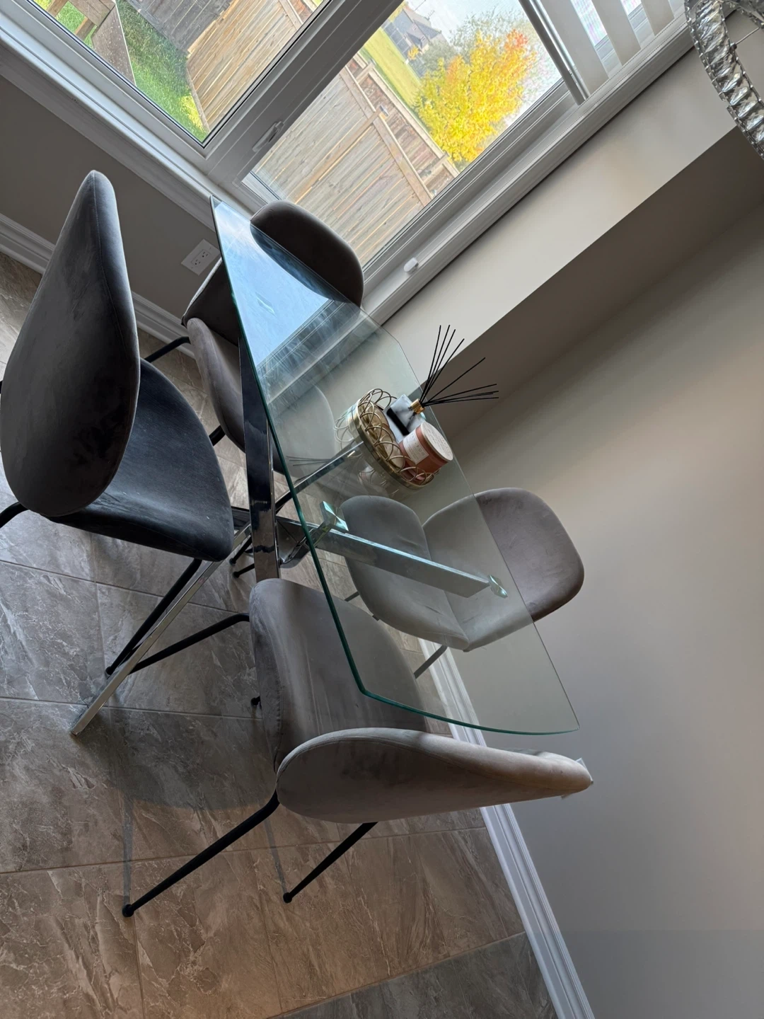 Modern dining set featuring a clear glass tabletop with a chrome base. Comes with four comfortable grey velvet chairs, each with black metal legs. This set offers a sleek look for your dining space.