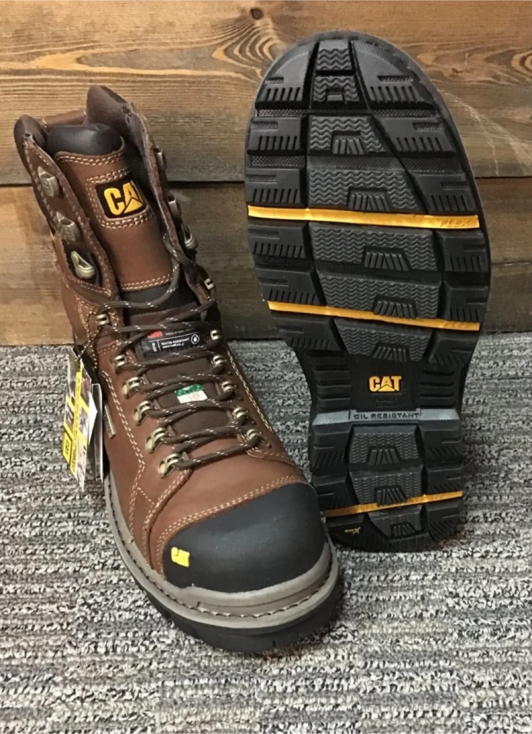 These Caterpillar work boots offer a composite toe for protection. They're waterproof to keep your feet dry. Rugged and durable for tough jobs!