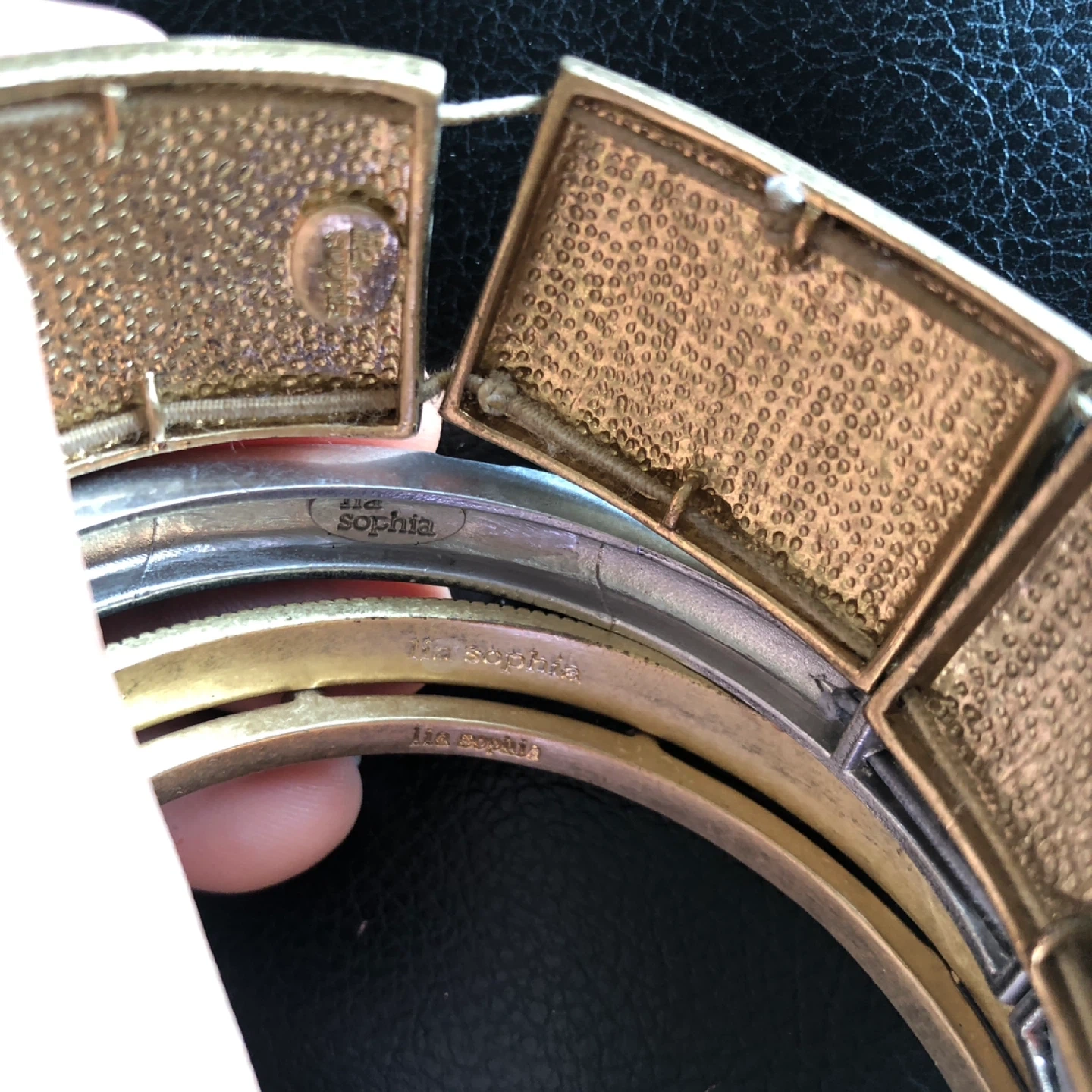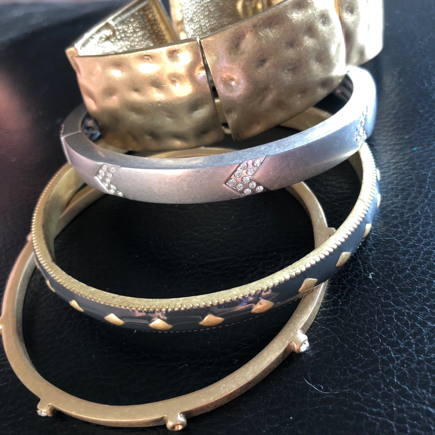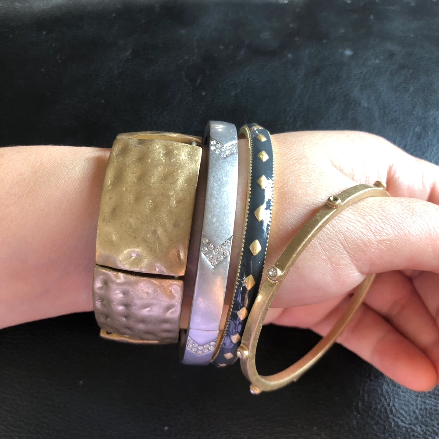 This set includes five Lia Sophia bracelets. There's a textured gold-tone cuff, a silver-tone bangle with rhinestones, and two other bangles featuring dark grey and black enamel details. They're perfect for stacking or wearing individually!