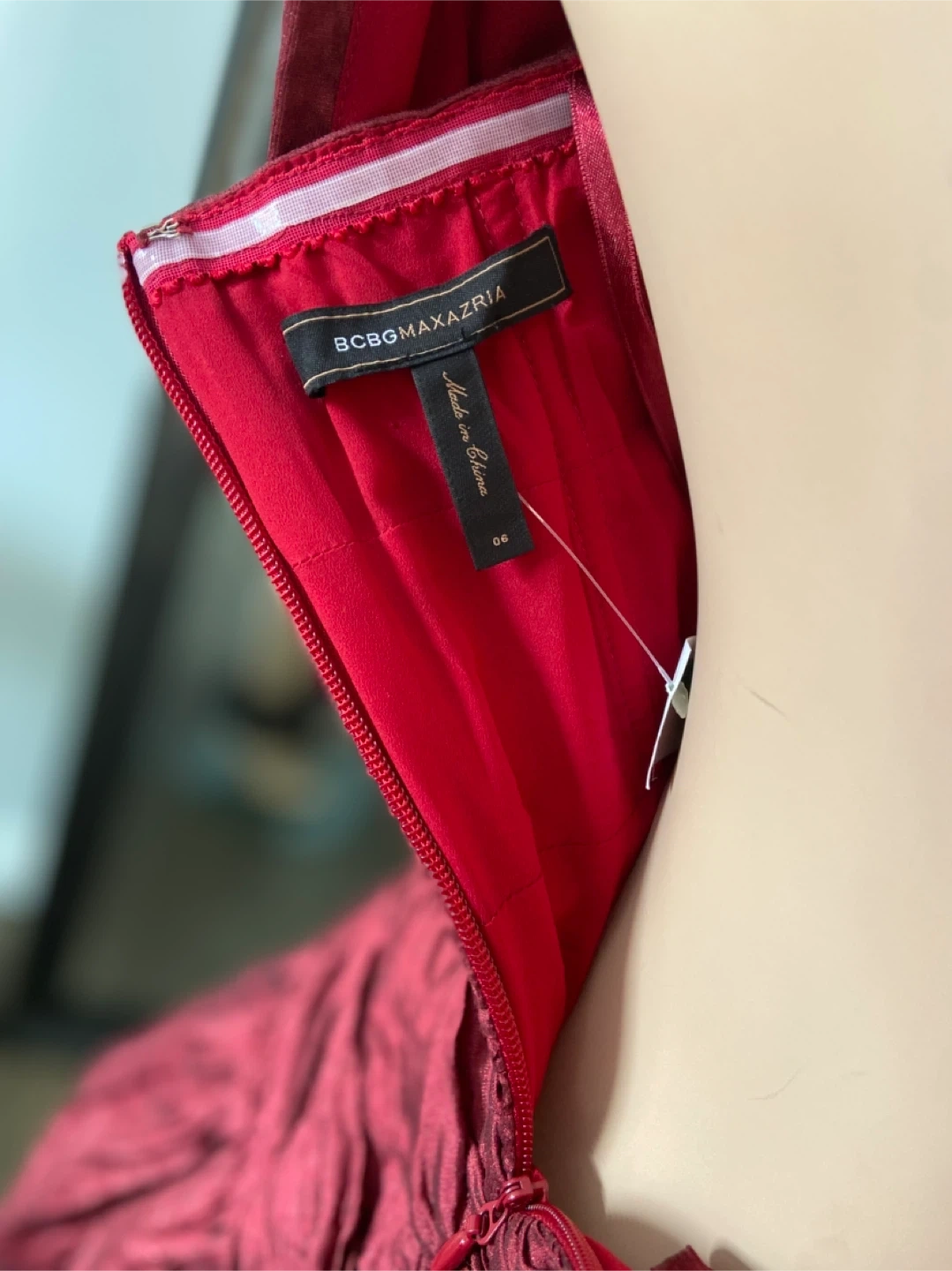 NWOT BCBG Max Azria Red Metallic Shirred One-Shoulder Above Knee Ruched Bubble Hem Lined Chiffon Cocktail Dress (Size 6)