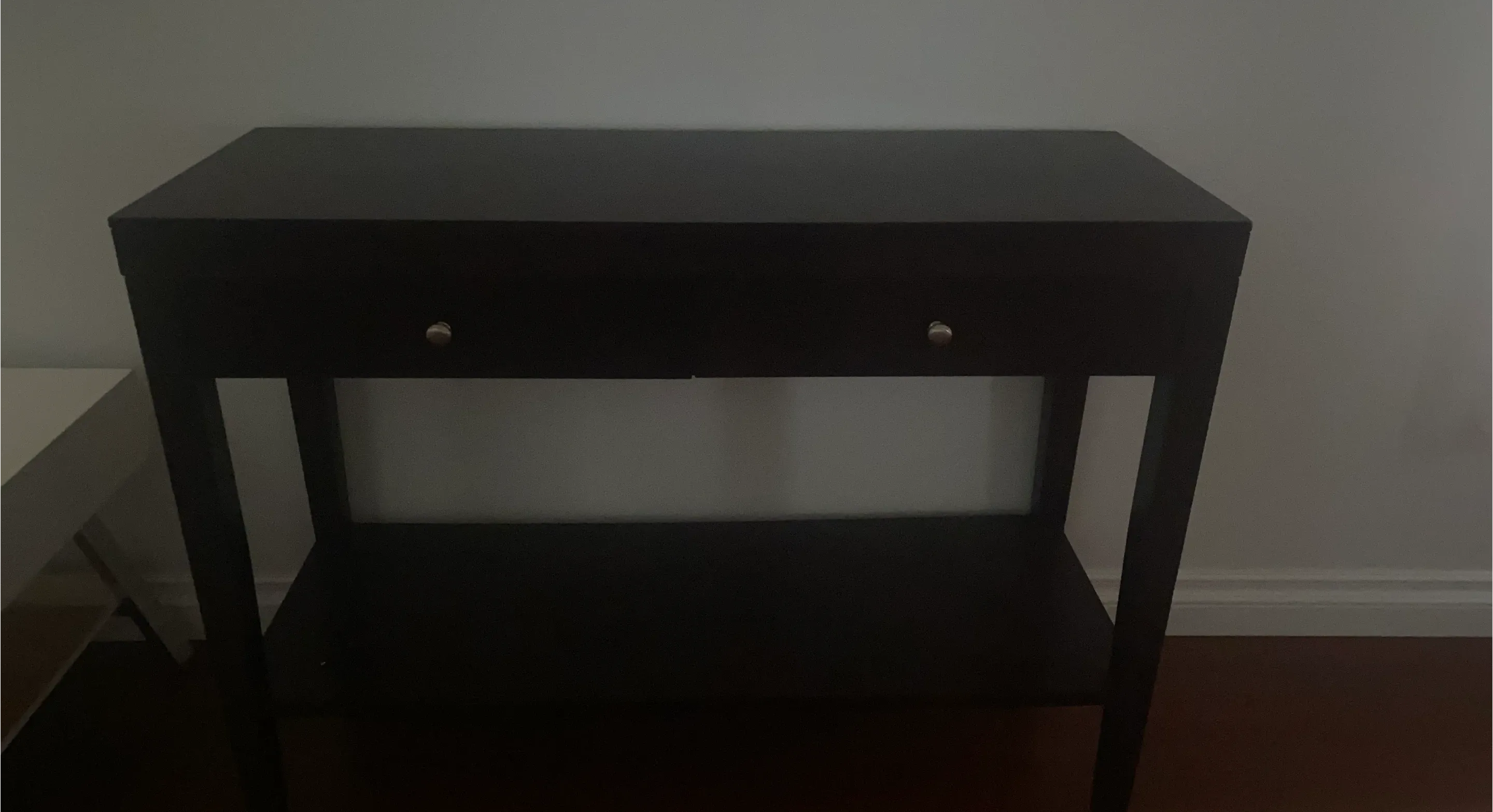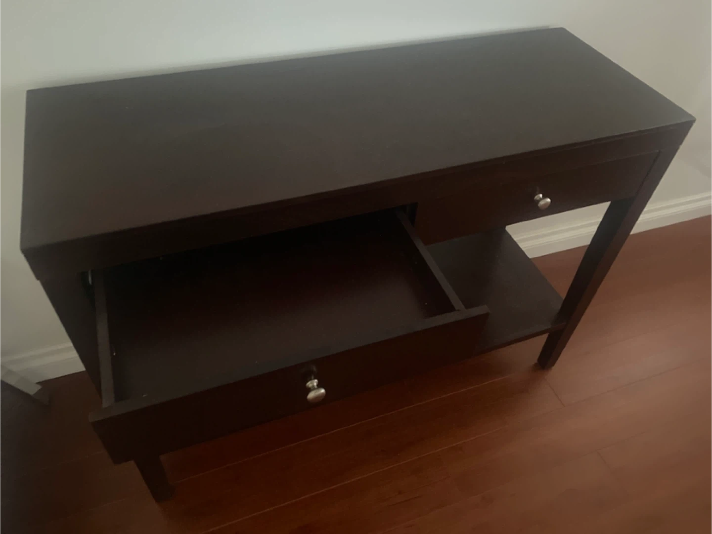 Dark brown console table with 2 drawers and an open shelf below. It's a simple and functional piece. Measures approximately 30”high x 41" wide x 15" deep.