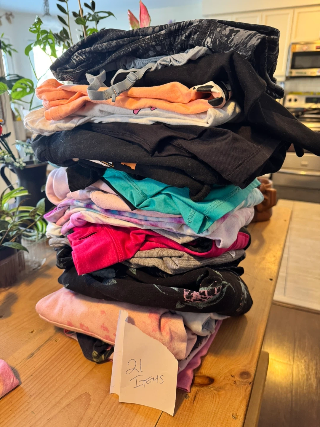 Girls size large to xtra large. This is a bundle of 21 assorted girls' clothing items. Includes a variety of tops and bottoms in different colours and prints. Sizes and materials vary across the items.