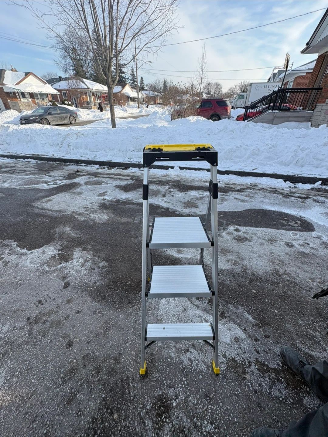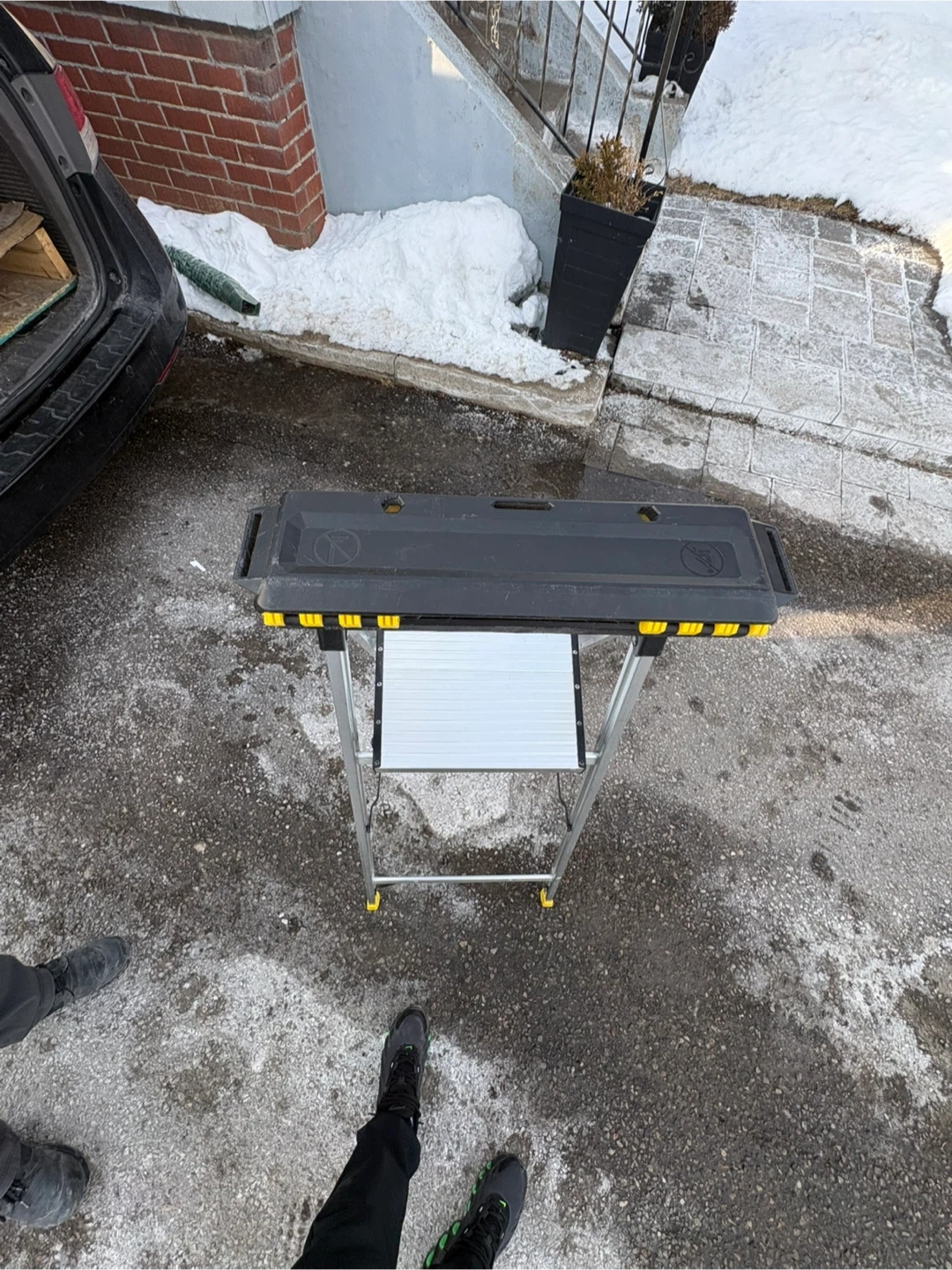This Gorilla ladder work platform has multiple levels and a sturdy build. It's ideal for various DIY and home improvement tasks. The platform is foldable for easy storage.