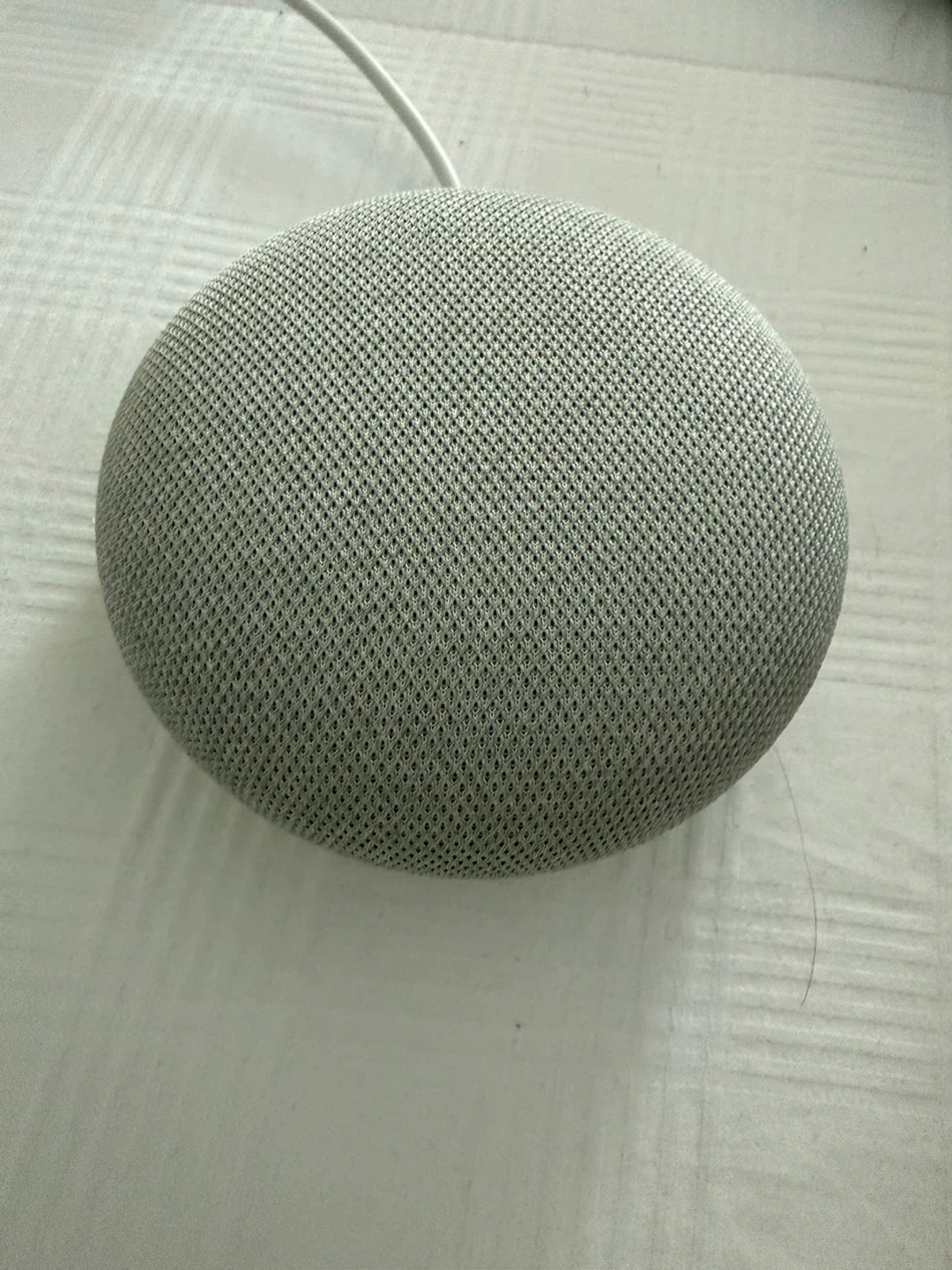 Google Nest Mini smart speaker in grey. It's a compact device that plays music, answers questions, and controls smart home devices. Includes power adapter.
