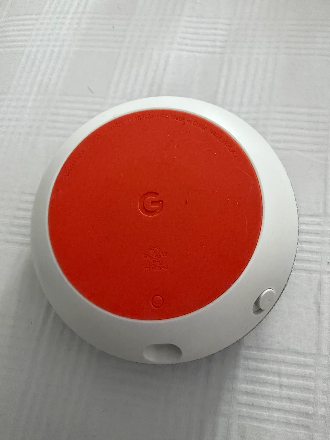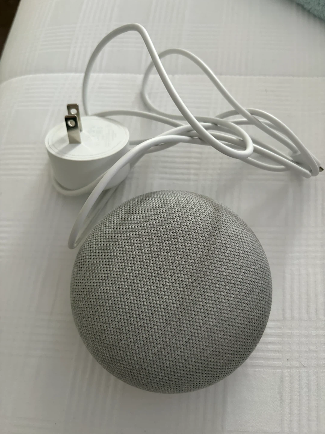 Google Nest Mini smart speaker in grey. It's a compact device that plays music, answers questions, and controls smart home devices. Includes power adapter.