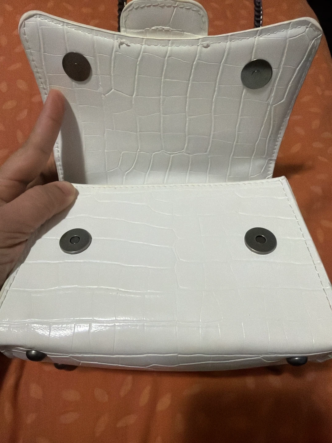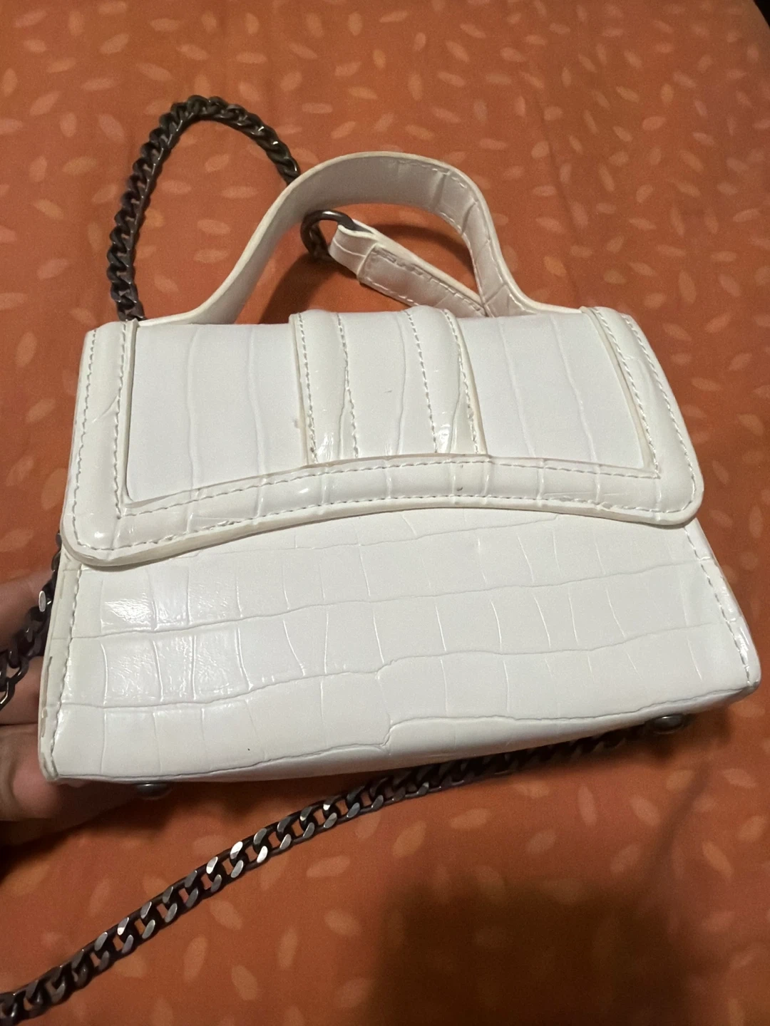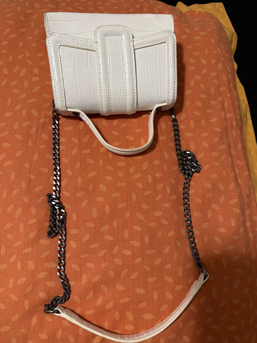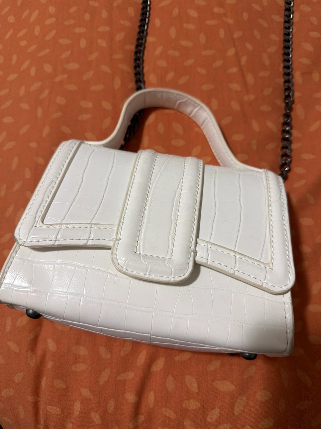 White mini handbag with a croc-embossed texture and a chain strap. It features a top handle for carrying. The snap closure keeps your belongings secure. This bag is small and stylish!