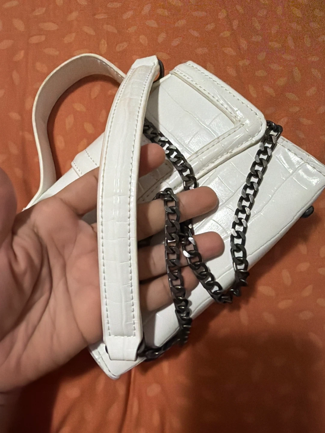 White mini handbag with a croc-embossed texture and a chain strap. It features a top handle for carrying. The snap closure keeps your belongings secure. This bag is small and stylish!