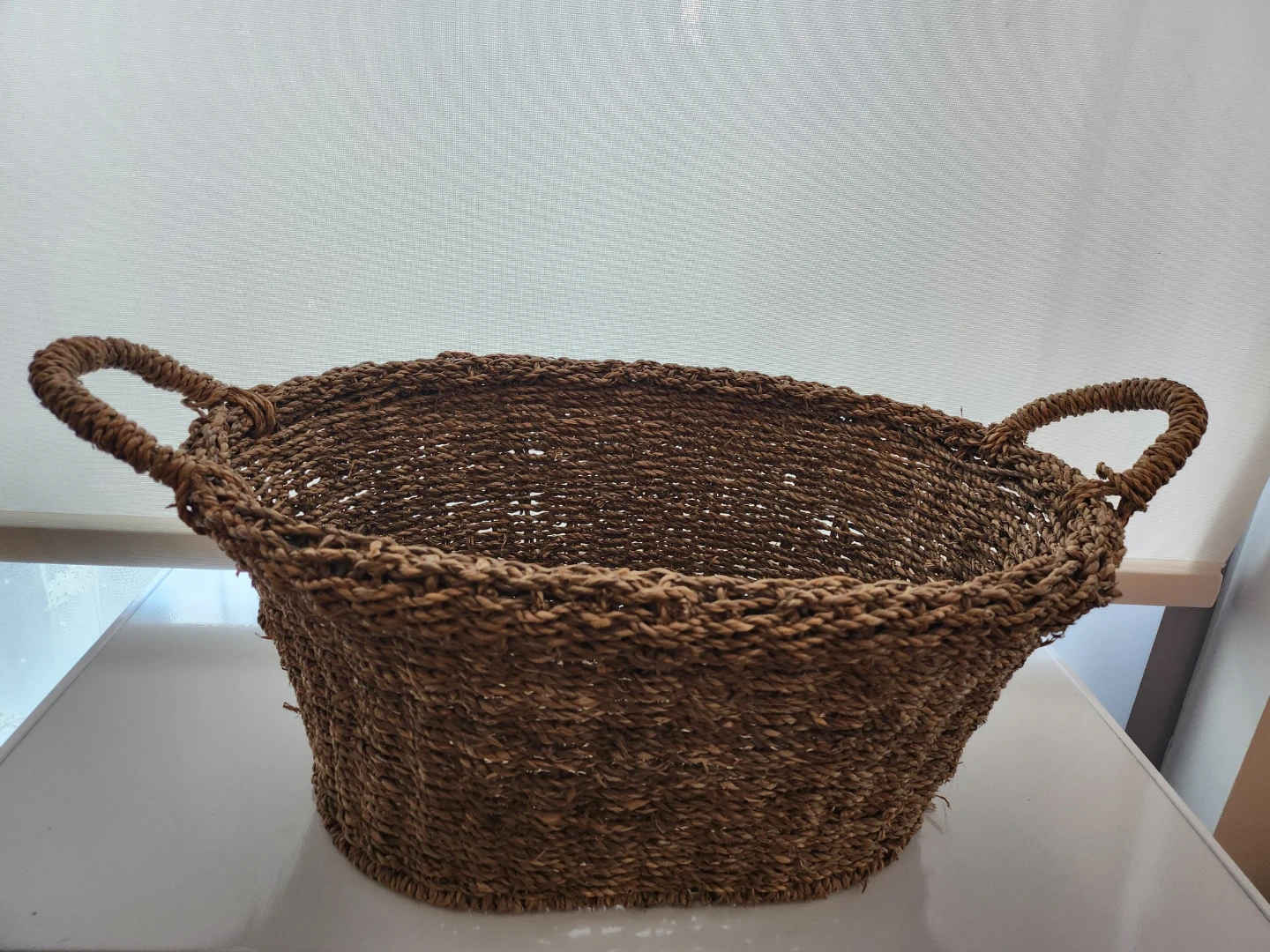 A handcrafted woven basket with sturdy handles. Its natural material adds a rustic touch to any room. This basket is roughly 40cm wide.
