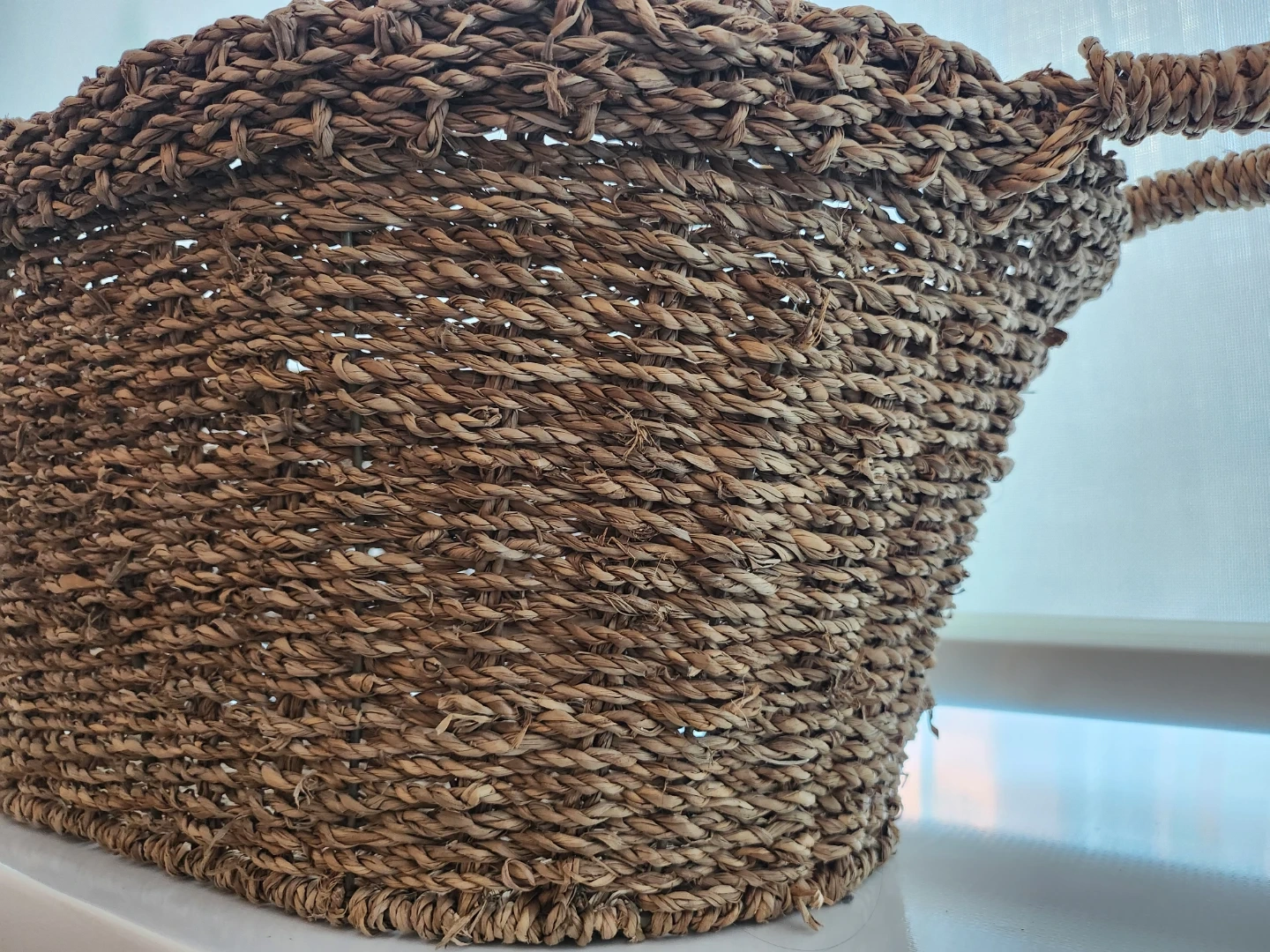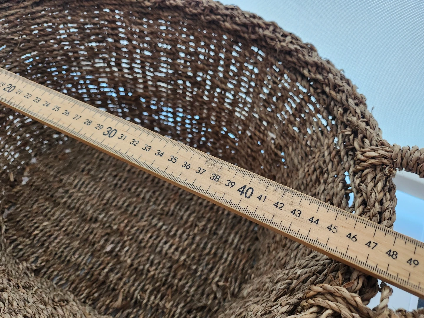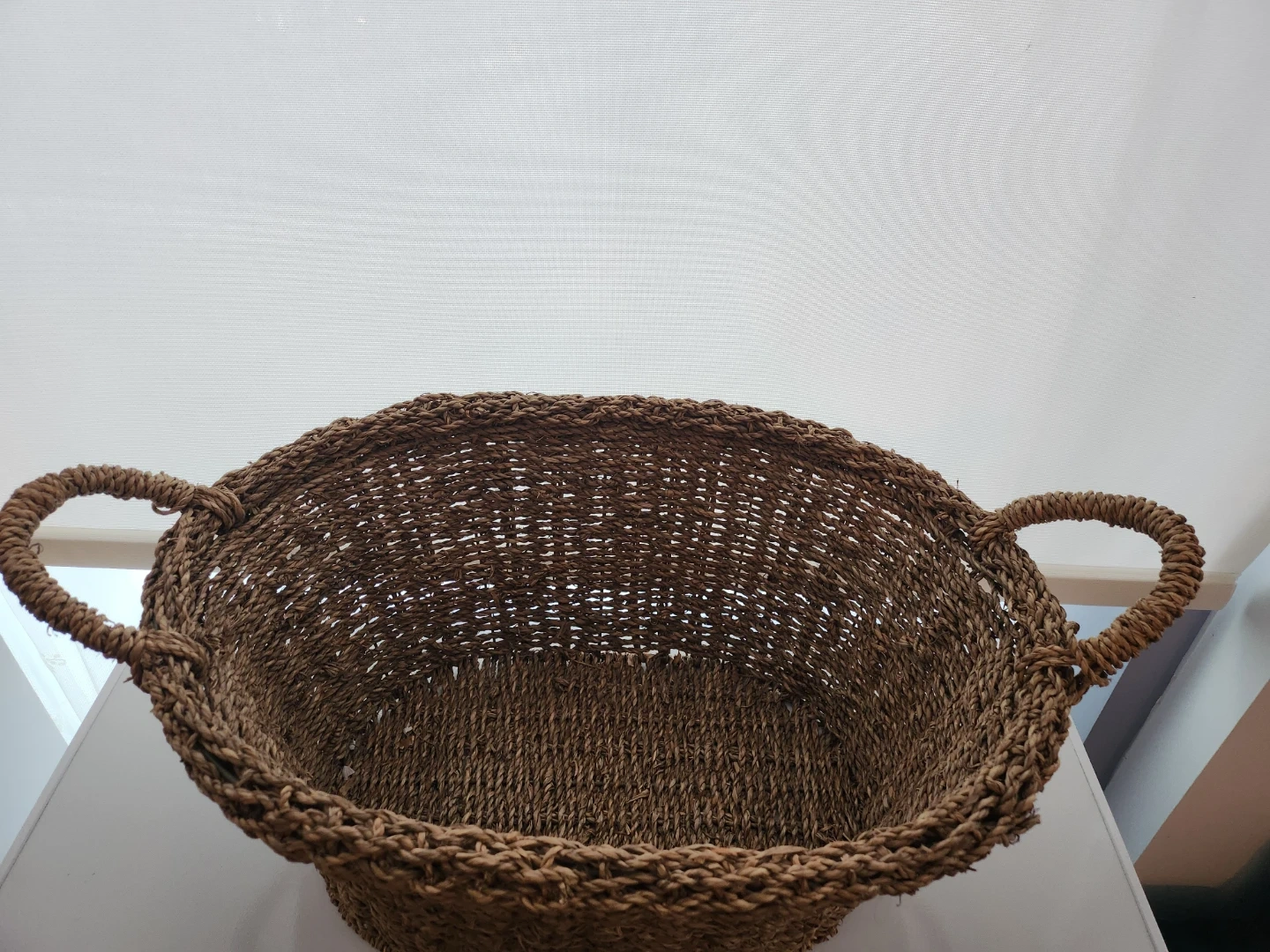 A handcrafted woven basket with sturdy handles. Its natural material adds a rustic touch to any room. This basket is roughly 40cm wide.