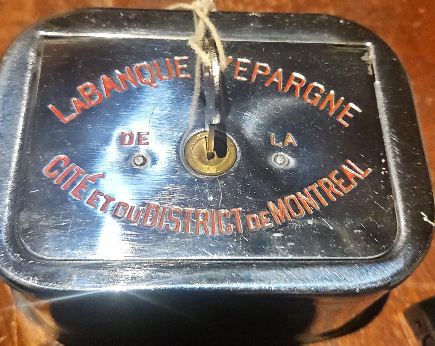Vintage metal piggy bank from La Banque d'Epargne de la Cité et du District de Montréal. It has a key lock mechanism for security. Great for coin collecting or as a decorative piece.