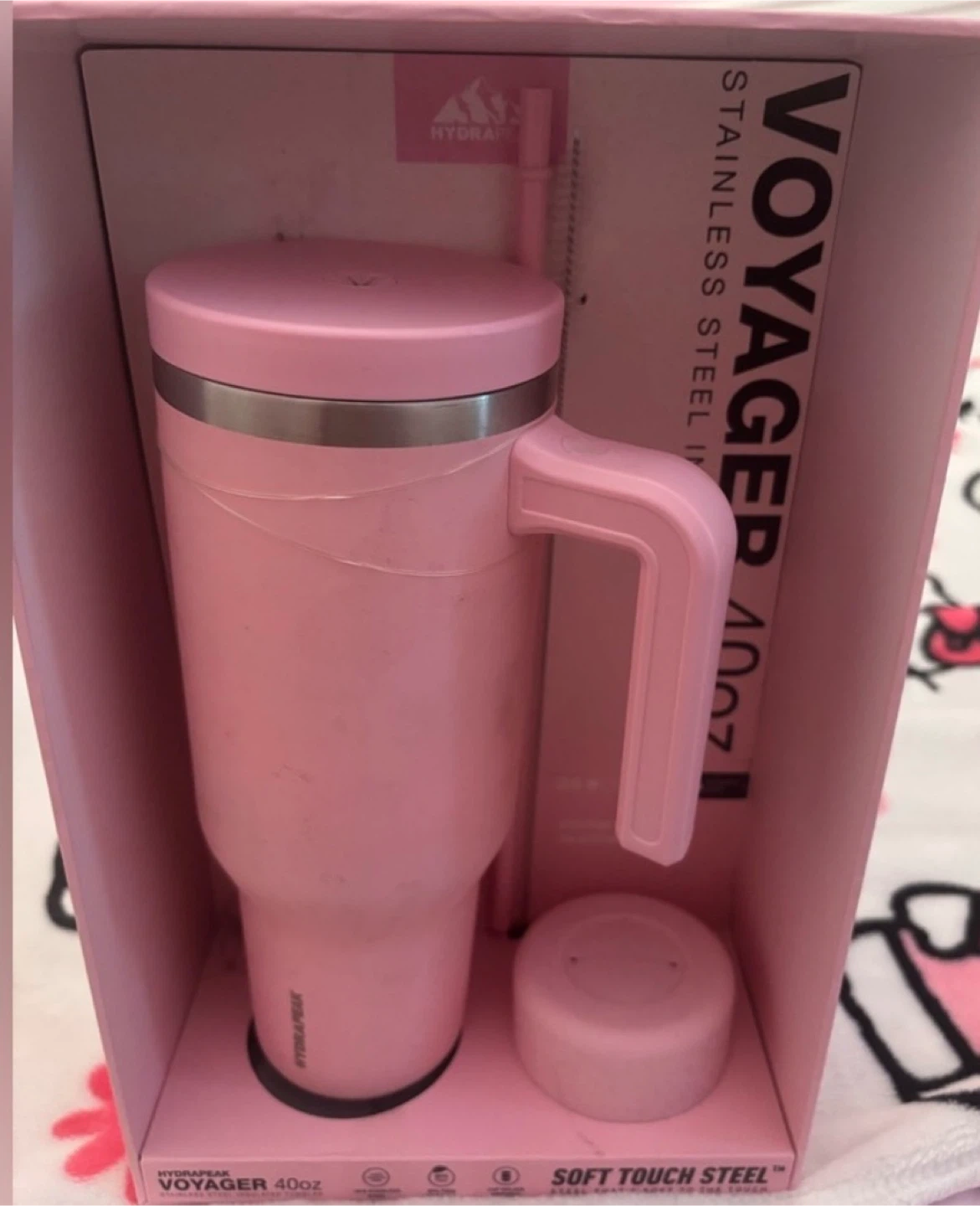 This HYDRAPEAK Voyager tumbler is 40oz and made of 18/8 stainless steel. It offers double-walled insulation and is cup holder friendly. It keeps drinks cold for 24 hours and hot for 10 hours!