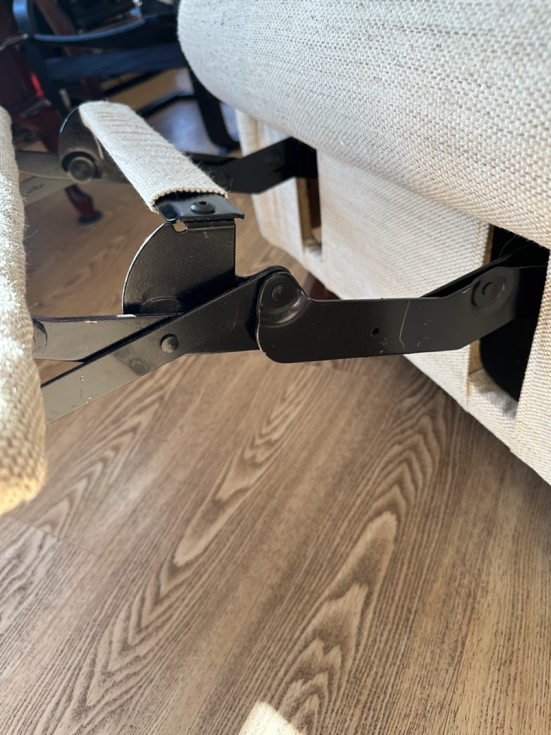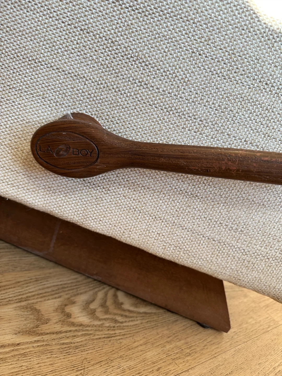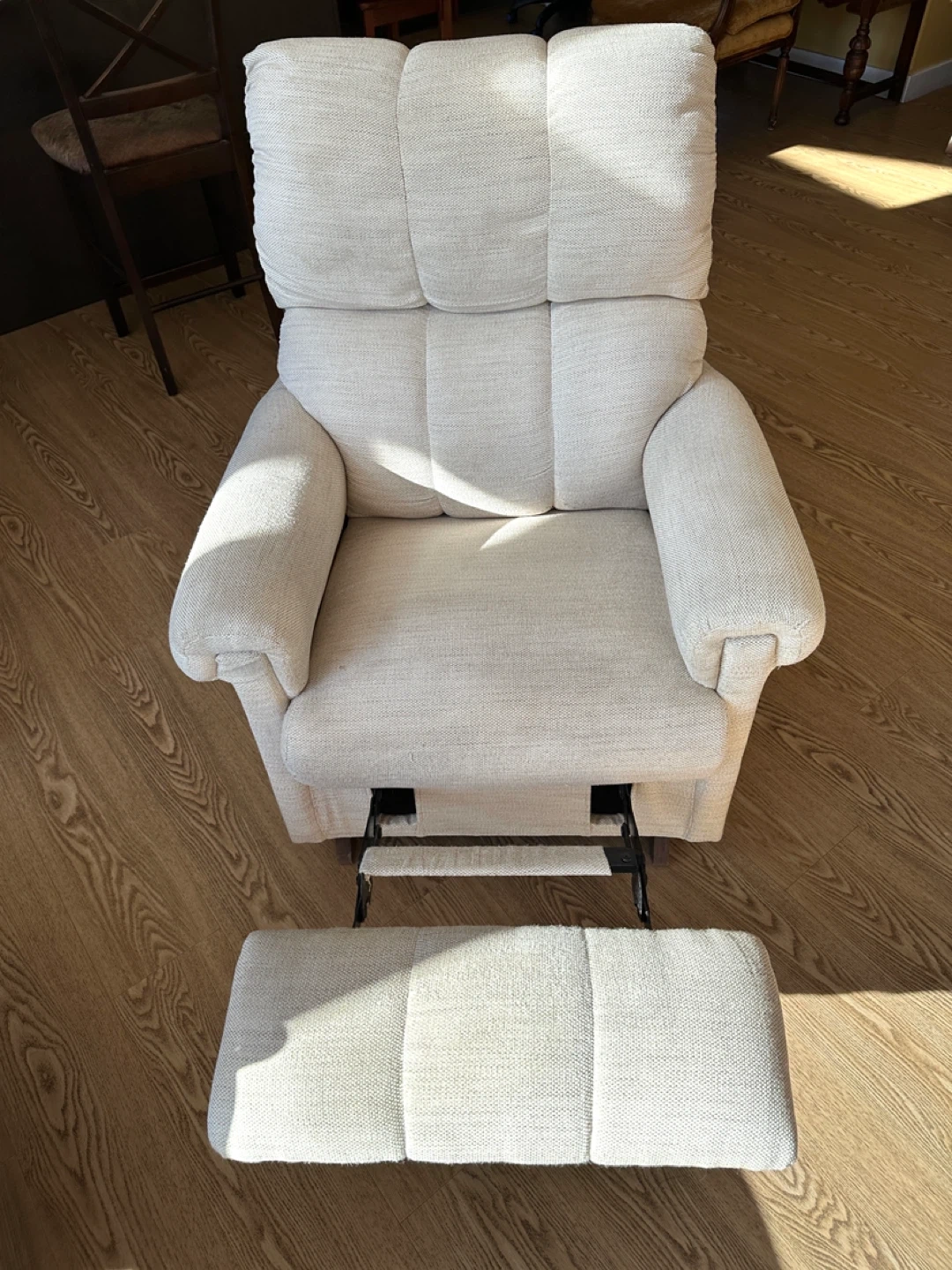 Genuine La-Z-Boy recliner in a neutral light beige fabric. Extremely comfortable with plush cushioning and smooth reclining action. Well cared for and sturdy.
