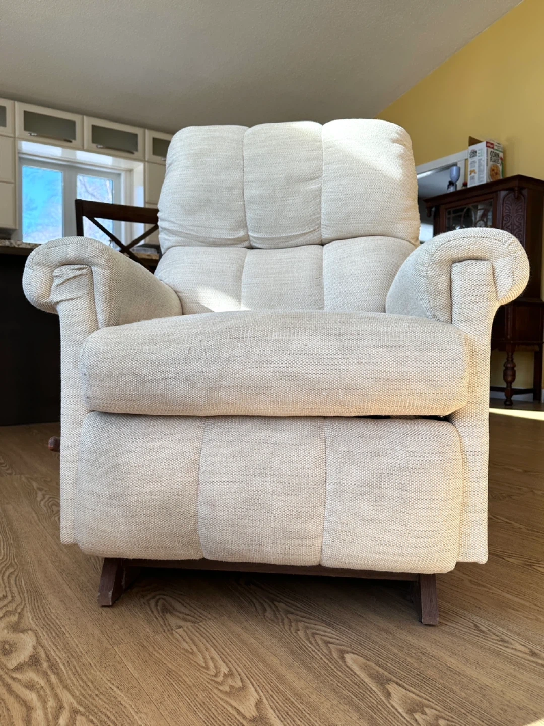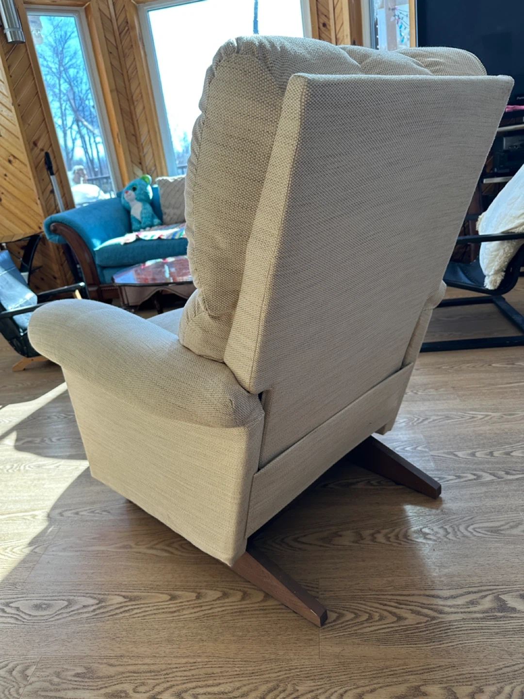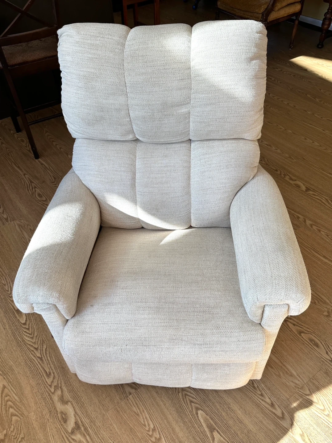 Genuine La-Z-Boy recliner in a neutral light beige fabric. Extremely comfortable with plush cushioning and smooth reclining action. Well cared for and sturdy.
