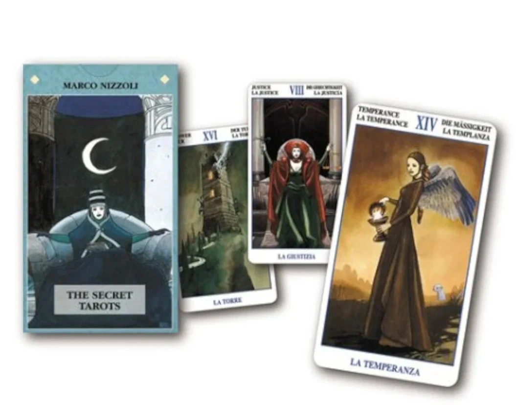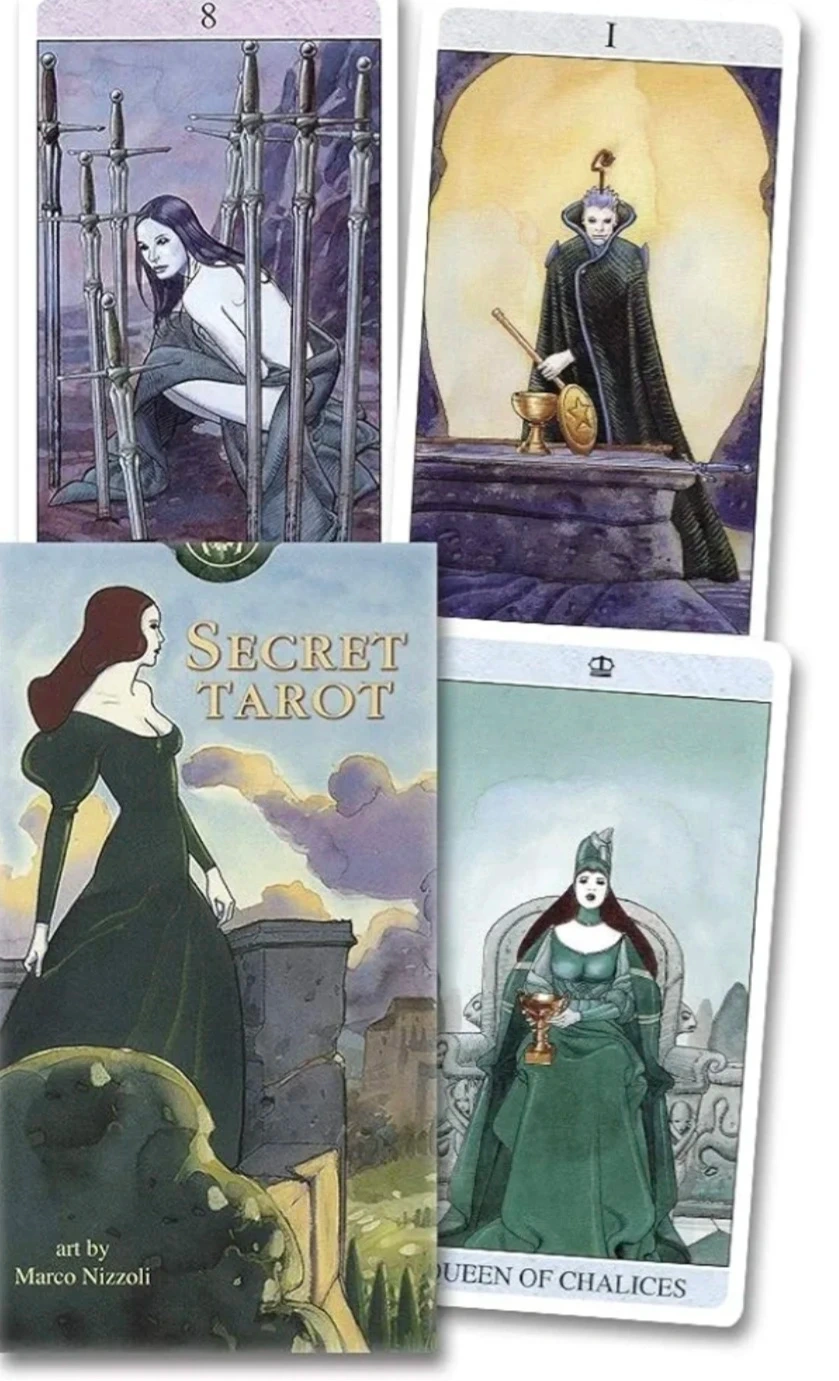 A complete Secret Tarot deck featuring art by Marco Nizzoli. This deck offers unique illustrations for each card. Perfect for tarot enthusiasts and collectors.
