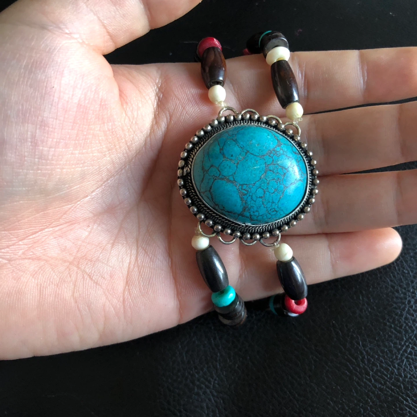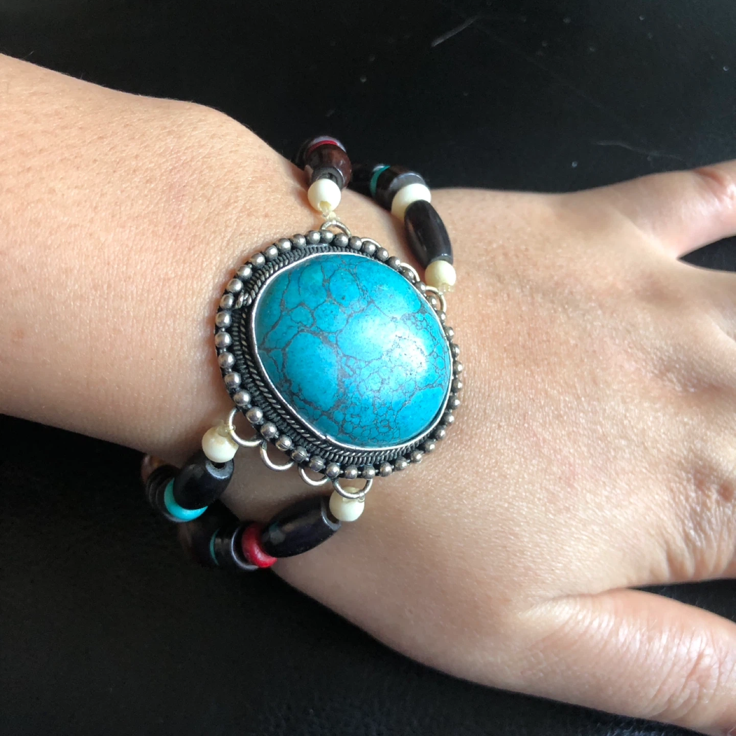 This bracelet features a large, oval turquoise-like stone surrounded by intricate silver-tone metalwork. It's strung with a colorful mix of wooden, bone, and glass beads in shades of brown, black, red, white, and orange. The unique design adds a bohemian touch.
