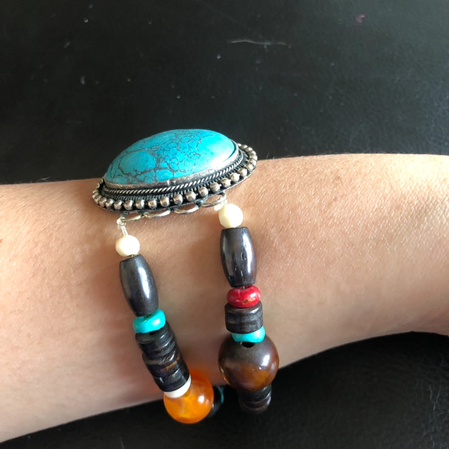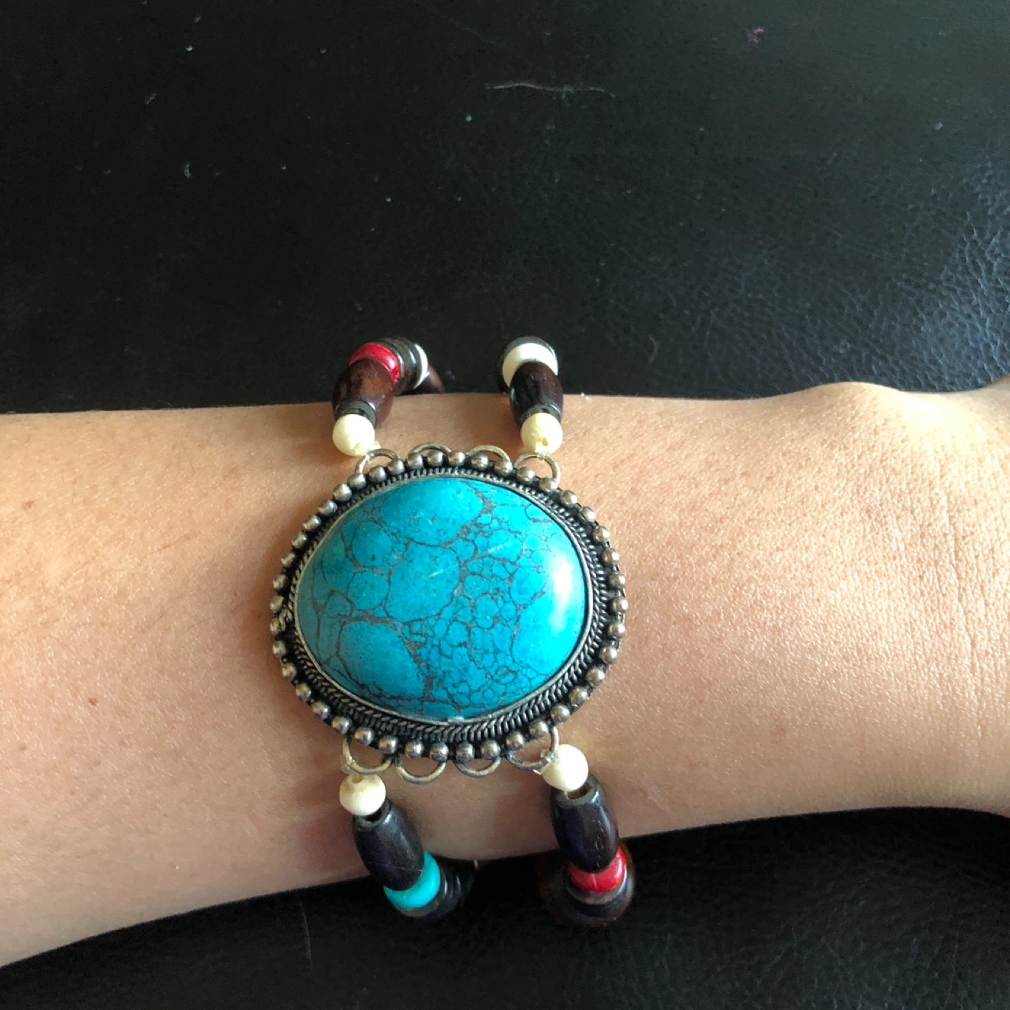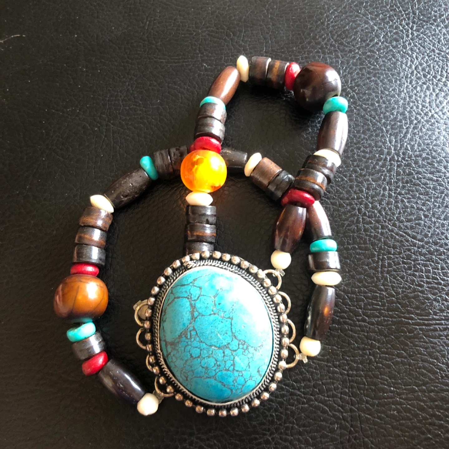 This bracelet features a large, oval turquoise-like stone surrounded by intricate silver-tone metalwork. It's strung with a colorful mix of wooden, bone, and glass beads in shades of brown, black, red, white, and orange. The unique design adds a bohemian touch.