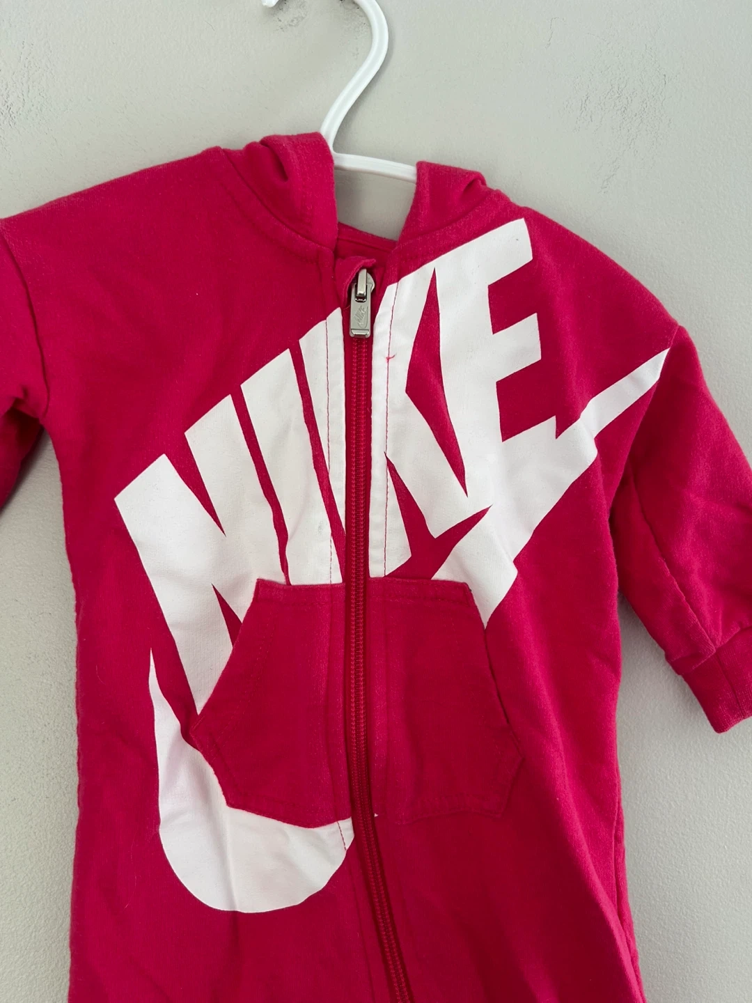 Nike brand. Zip up hooded sweater romper. Pink with white logo. Size 3/6m. Brand new condition