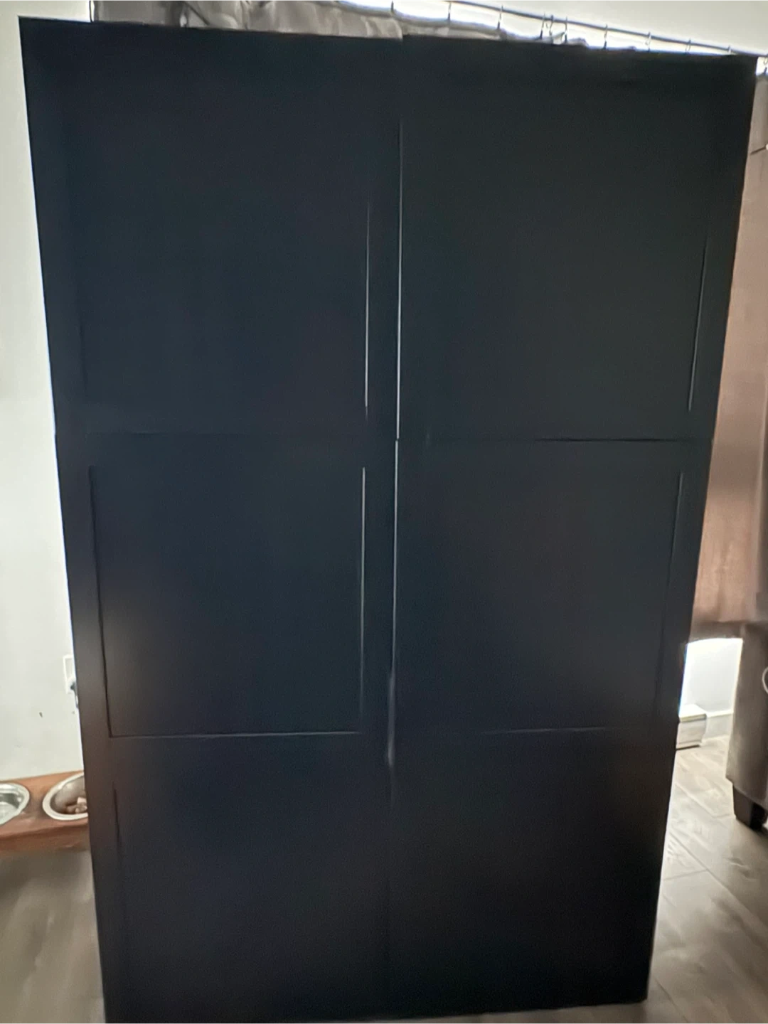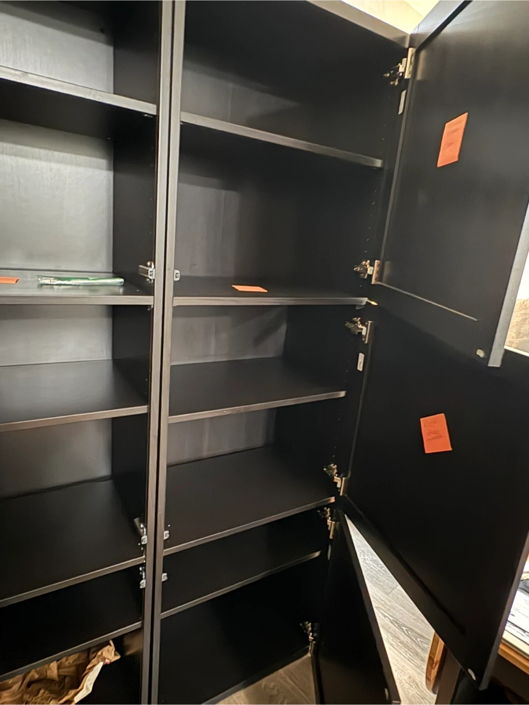 Double IKEA Besta black shelf unit with doors. 2 single units that have been mounted together according to IKEA instructions. Tall black storage cabinet with multiple shelves. Doors open to reveal ample storage space. It's perfect for organizing books, clothes, or household items. Made of durable material. Each single unit has the following measurements: 23 5/8 x 16 1/2 x 76 inches