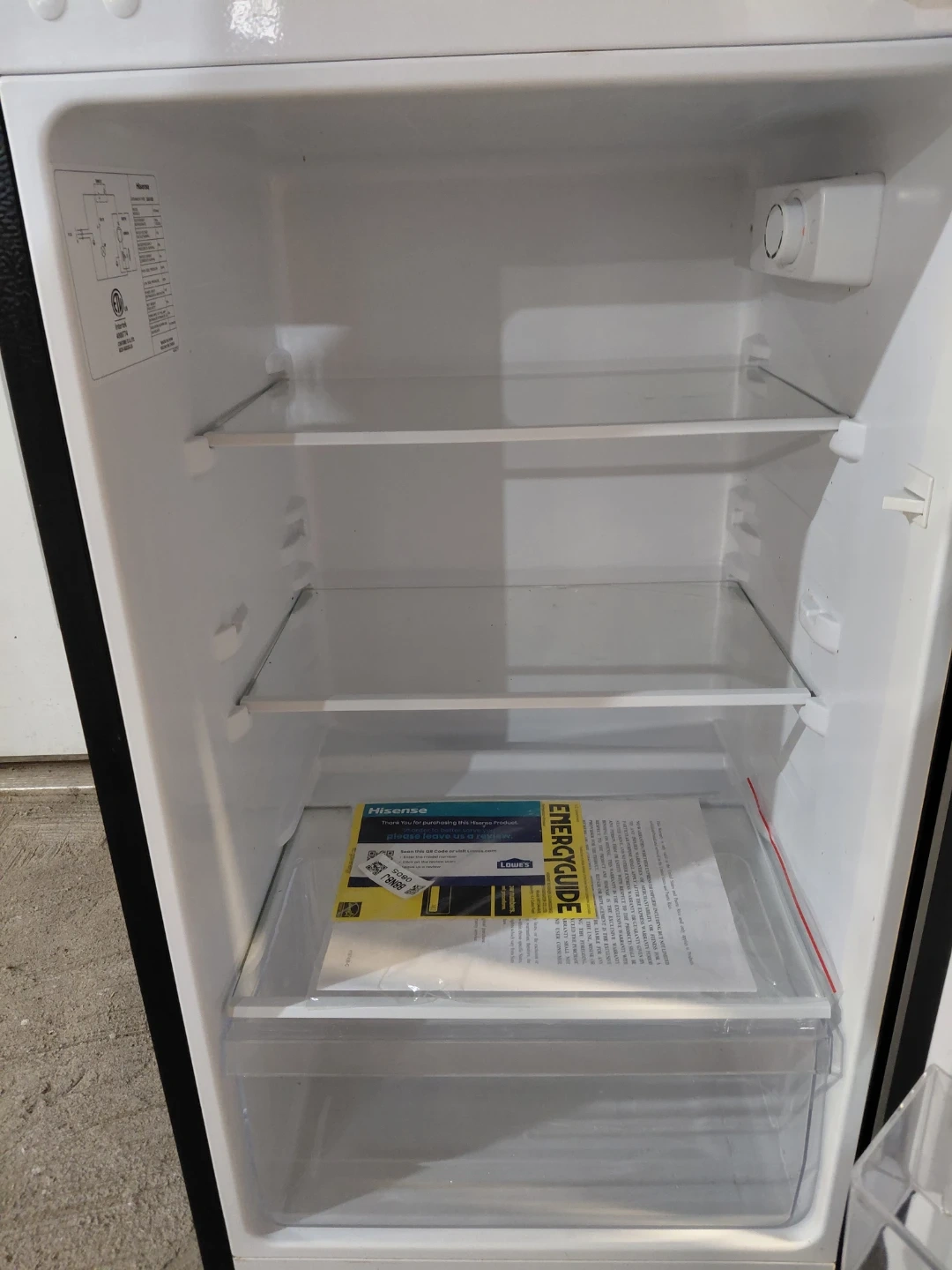 This is a Hisense compact refrigerator. It has multiple glass shelves and a crisper drawer. The exterior is silver and black.