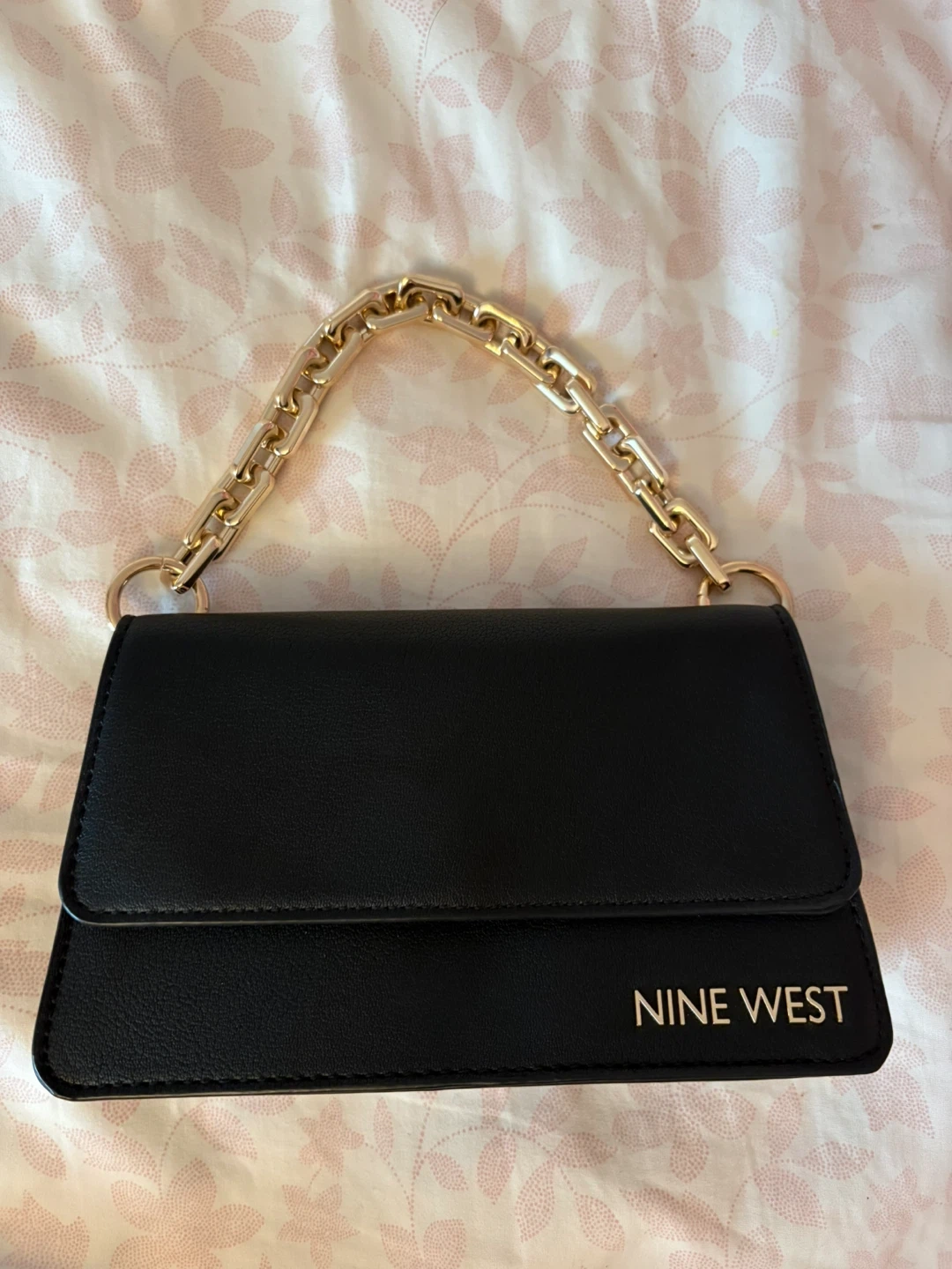 This is a black Nine West shoulder bag. It features a stylish gold-tone chain strap. It's made from faux leather.