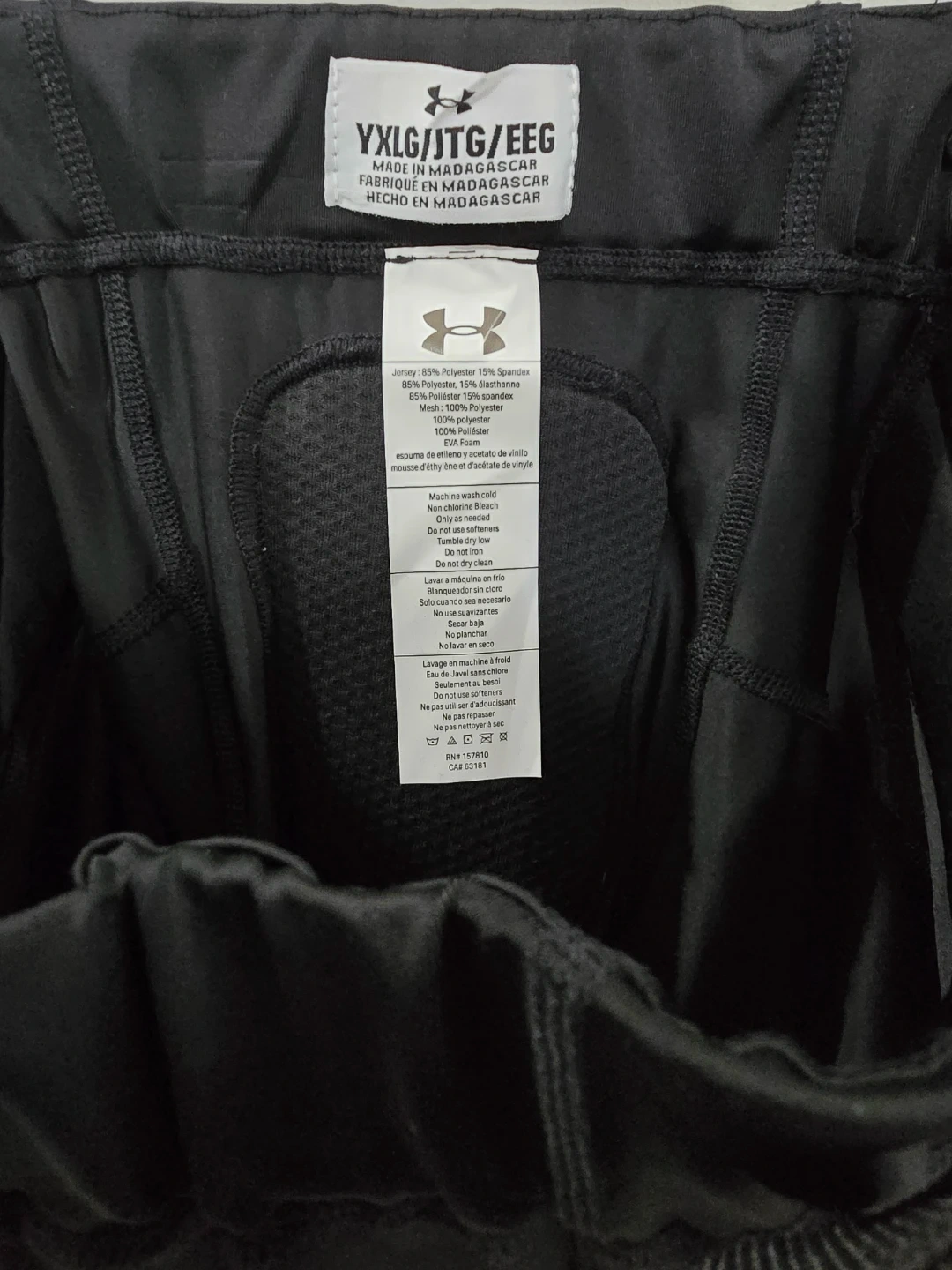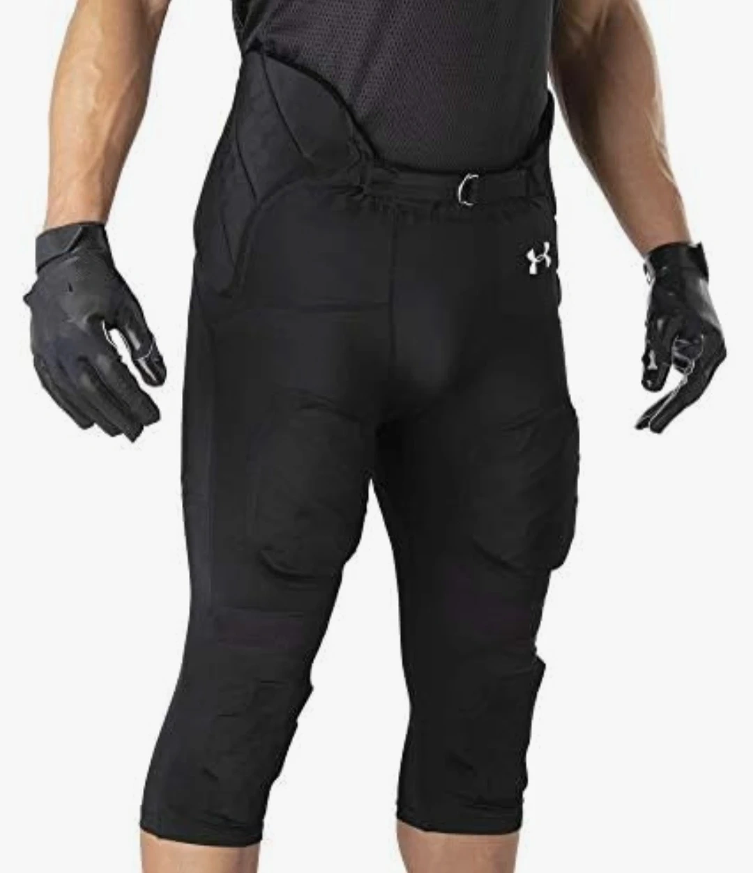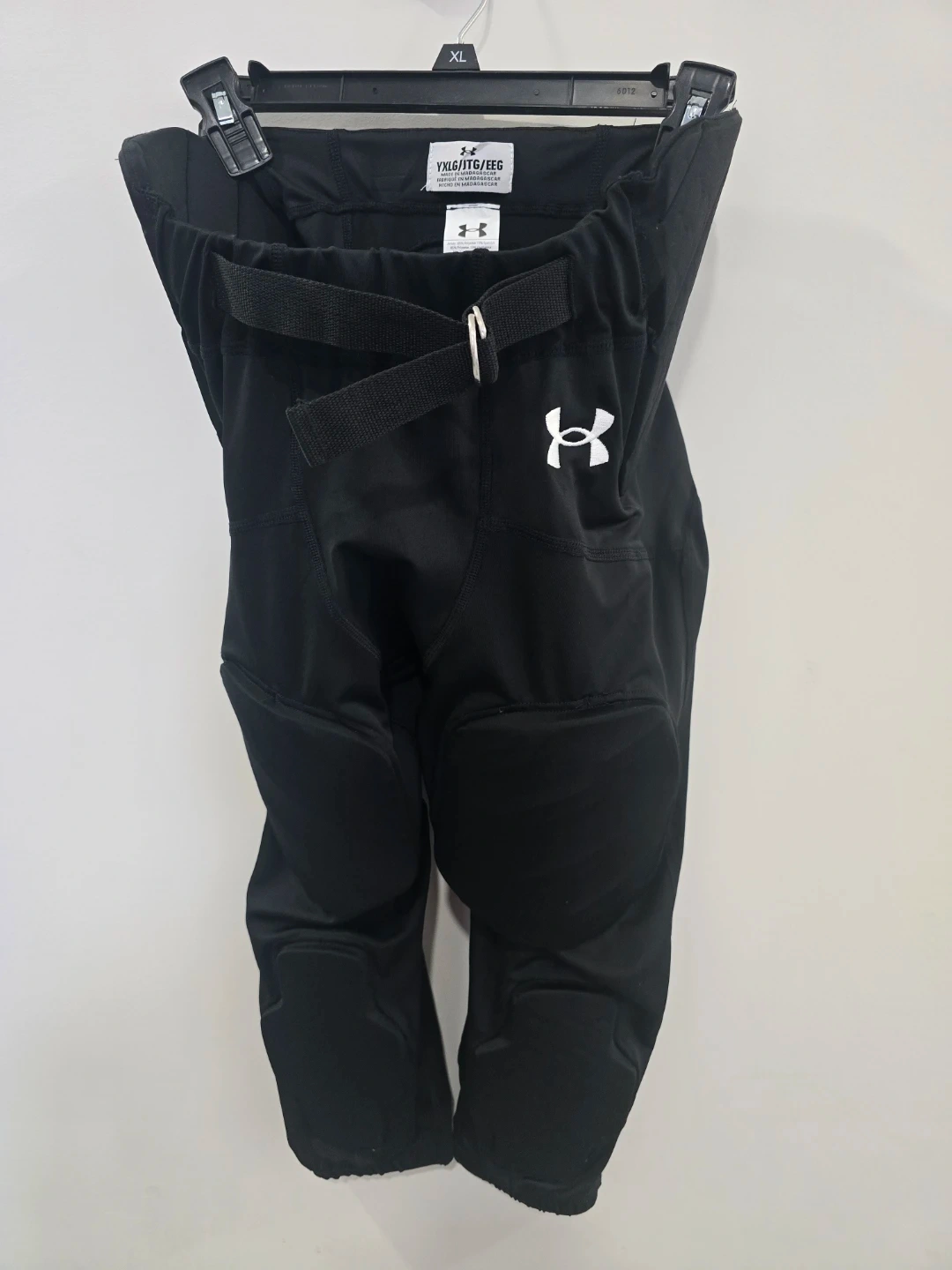 Black Under Armour padded compression pants for football. Jersey is 85% Polyester and 15% Spandex, while the mesh is 100% Polyester. Comes with integrated padding. Size YXL.