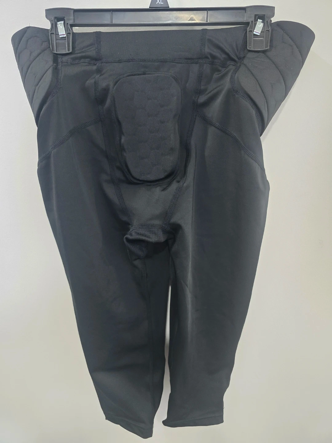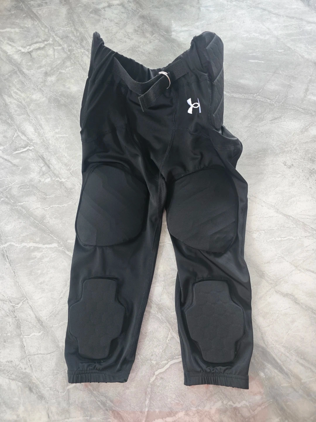 Black Under Armour padded compression pants for football. Jersey is 85% Polyester and 15% Spandex, while the mesh is 100% Polyester. Comes with integrated padding. Size YXL.