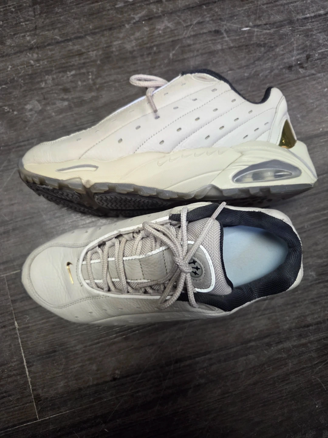 These Nike Air Max Tailwind IV shoes are a size US women's 7 They're a cream colour with gold accents. Features Nike Air cushioning in the sole for comfort. Great for everyday wear!
