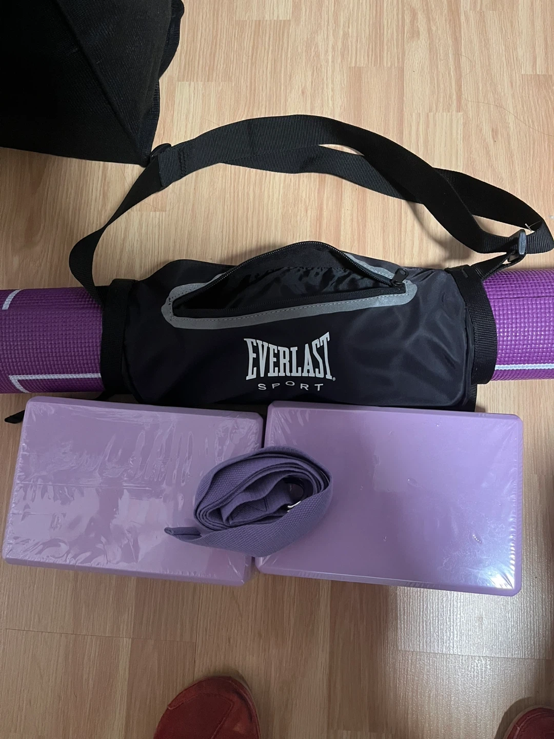 This set includes a purple yoga mat with a carrying strap and two light purple yoga blocks. The mat comes in a black Everlast bag with a zippered compartment and a shoulder strap. The yoga blocks are still in their original packaging.