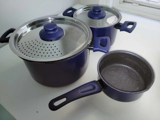This set of pots and pans are a fantastic addition to any kitchen. The set shows signs of use, but is still in good condition and ready for your next culinary adventure! Included: Large pot with straining lid, Medium pot with lid, Small saucepan, Frying pan. If the ad is up, the pots are available!