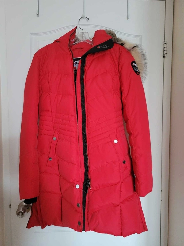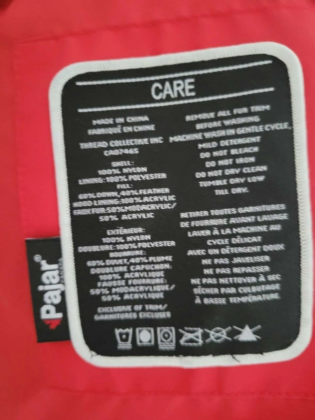 Stay warm and stylish this winter with this Pajar jacket, featuring a vibrant red colour and a cozy faux-fur-trimmed hood. This is a used jacket in good condition, and it has many winter days left in it. Outer shell: 100% Nylon. Lining: 100% Polyester. Fill: 60% Down, 40% Feather. Hood Lining: 50% Acrylic, 50% Modacrylic. If this ad is still up, the jacket is still available. Grab it before the next snowstorm!