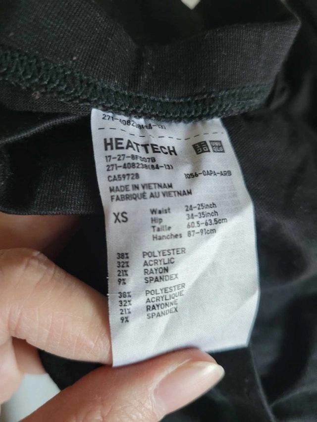 Uniqlo Heattech leggings in size XS, offering warmth and comfort in a sleek black design. These leggings are in used condition. Brand: Uniqlo, Size: XS, Colour: Black, Material: 38% polyester, 32% acrylic, 21% rayon, 9% spandex. Cash accepted.