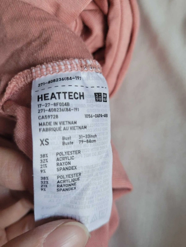 This is a pre-owned Uniqlo Heattech top in size XS, perfect for layering on chilly days! It's made with Heattech technology to keep you warm and comfortable. The top is in good condition, ready to be worn and loved. Specifications: * Brand: Uniqlo * Size: XS * Material: 38% Polyester, 32% Acrylic, 21% Rayon, 9% Spandex * Colour: Peach. If you're seeing this ad, it means this cozy top is still up for grabs!