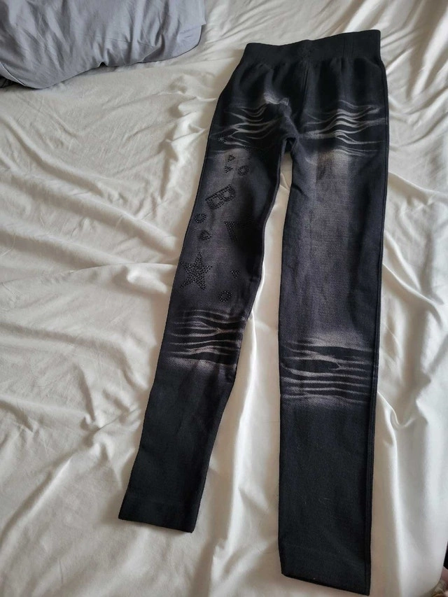 These are a pair of used leggings with a unique design, perfect for casual wear or workouts. They are in good condition and ready for a new home. Looking to add a bit of whimsy to your wardrobe? These leggings are just the ticket! If the ad is up, they're still available.