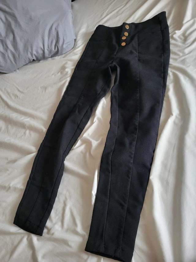The material is 97% cotton and 3% other fibres. They feature a sleek design with gold decorative buttons. These pants are in good condition, showing minimal signs of wear. Size: 27/28. Colour: Black. Similar pants on Kijiji go for around $20, so I am listing them accordingly. If the ad is up, it's available! Cash accepted.