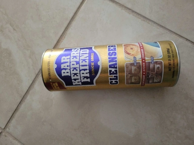 This is a 21oz can of Bar Keepers Friend Cleanser, perfect for stainless steel, porcelain, and more. The can is new and ready to tackle tough stains in your kitchen and bathroom. Ideal for stainless steel, porcelain, ceramic, glass, and other surfaces. Removes rust, tarnish, mineral deposits, and soap scum. Cash accepted.