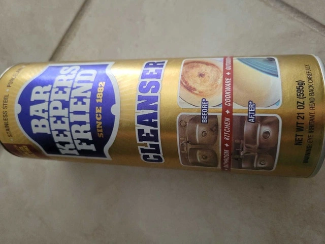 This is a 21oz can of Bar Keepers Friend Cleanser, perfect for stainless steel, porcelain, and more. The can is new and ready to tackle tough stains in your kitchen and bathroom. Ideal for stainless steel, porcelain, ceramic, glass, and other surfaces. Removes rust, tarnish, mineral deposits, and soap scum. Cash accepted.