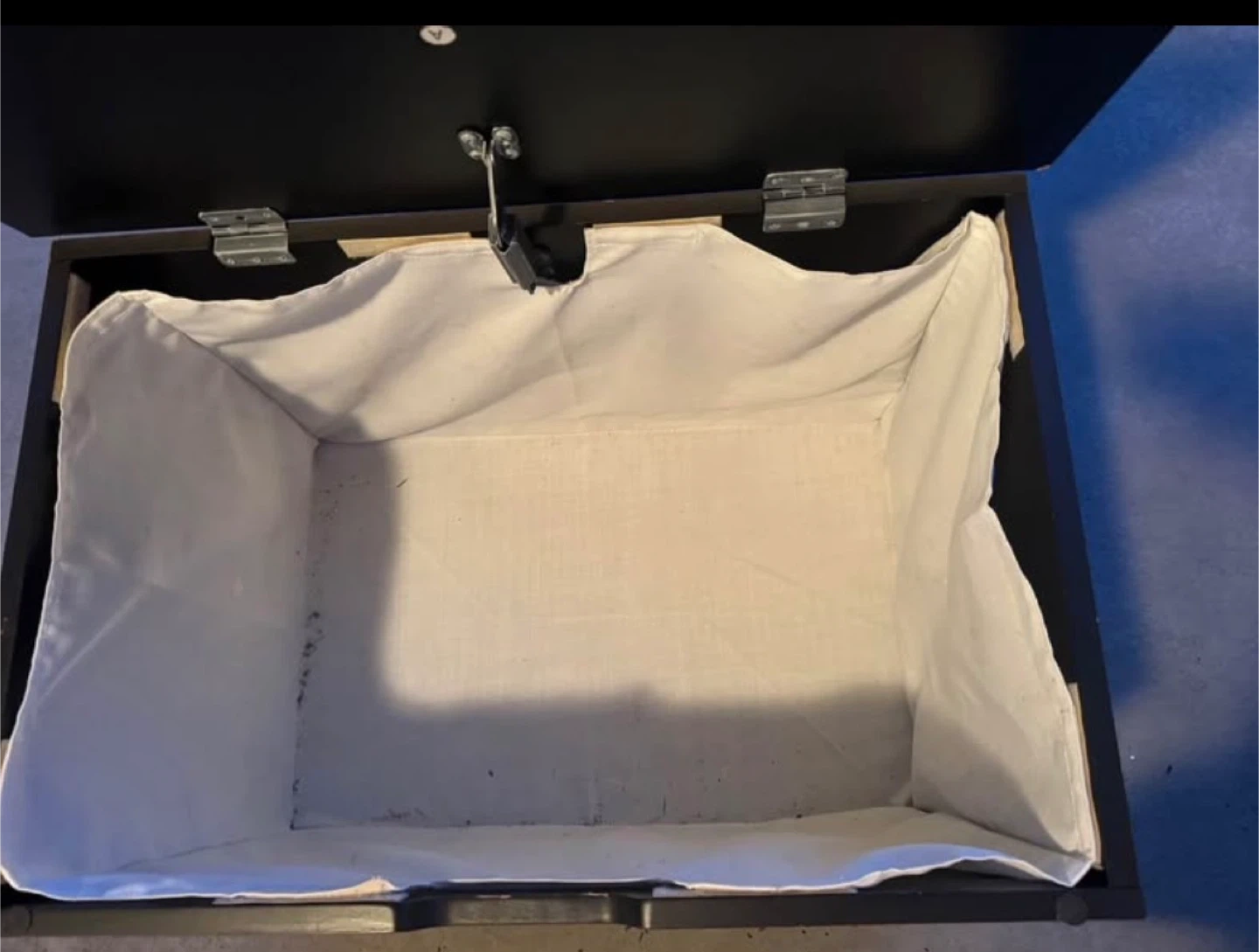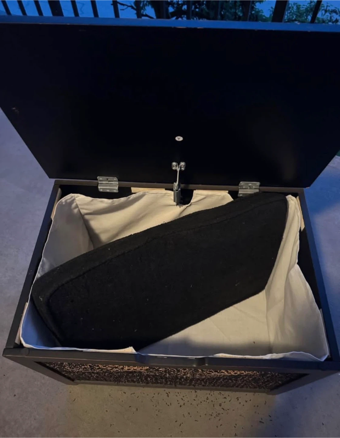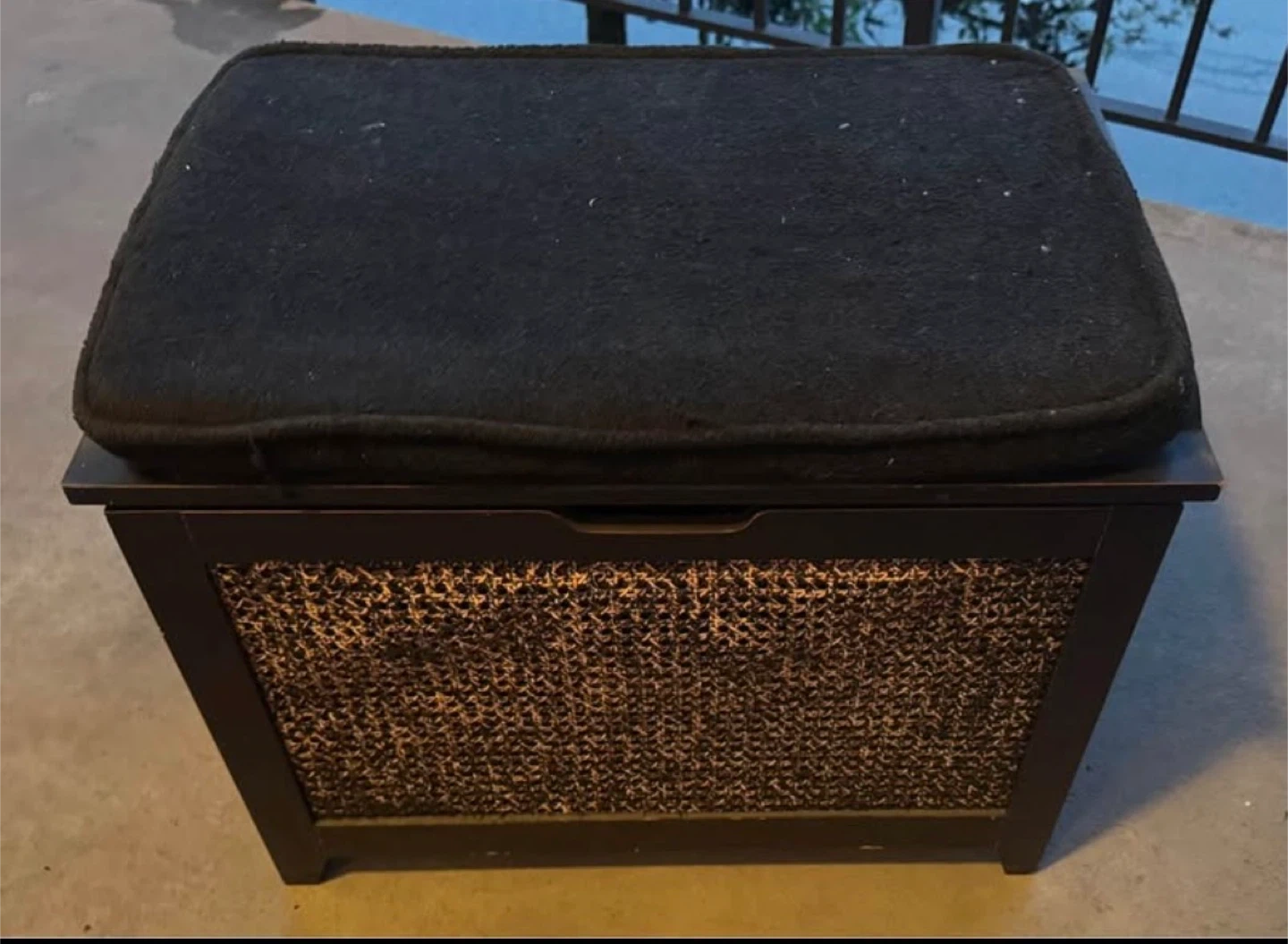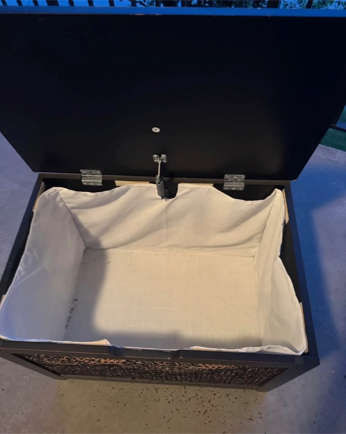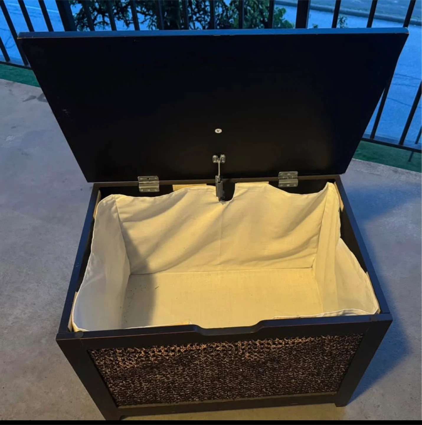 This storage ottoman bench is dark brown with a textured front panel. It includes a removable fabric liner for the main compartment. The hinged lid opens to reveal storage space. It's great for stowing away blankets or toys!