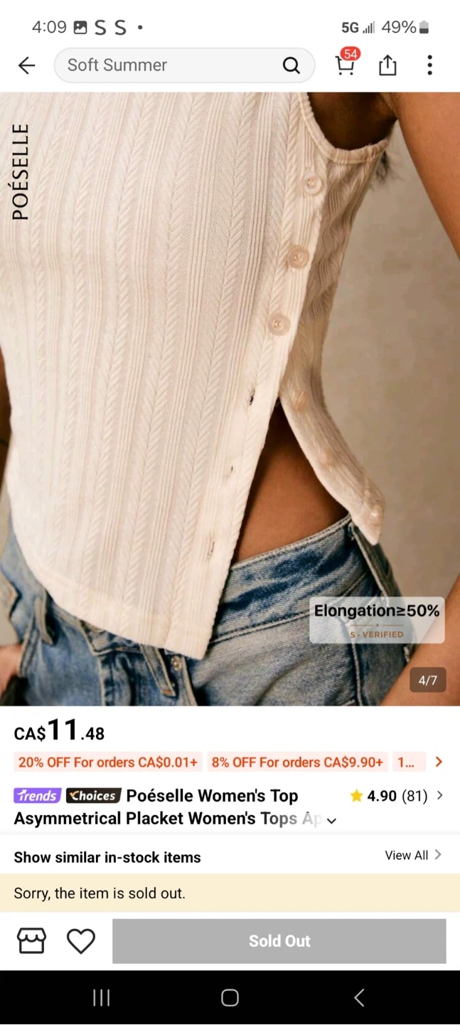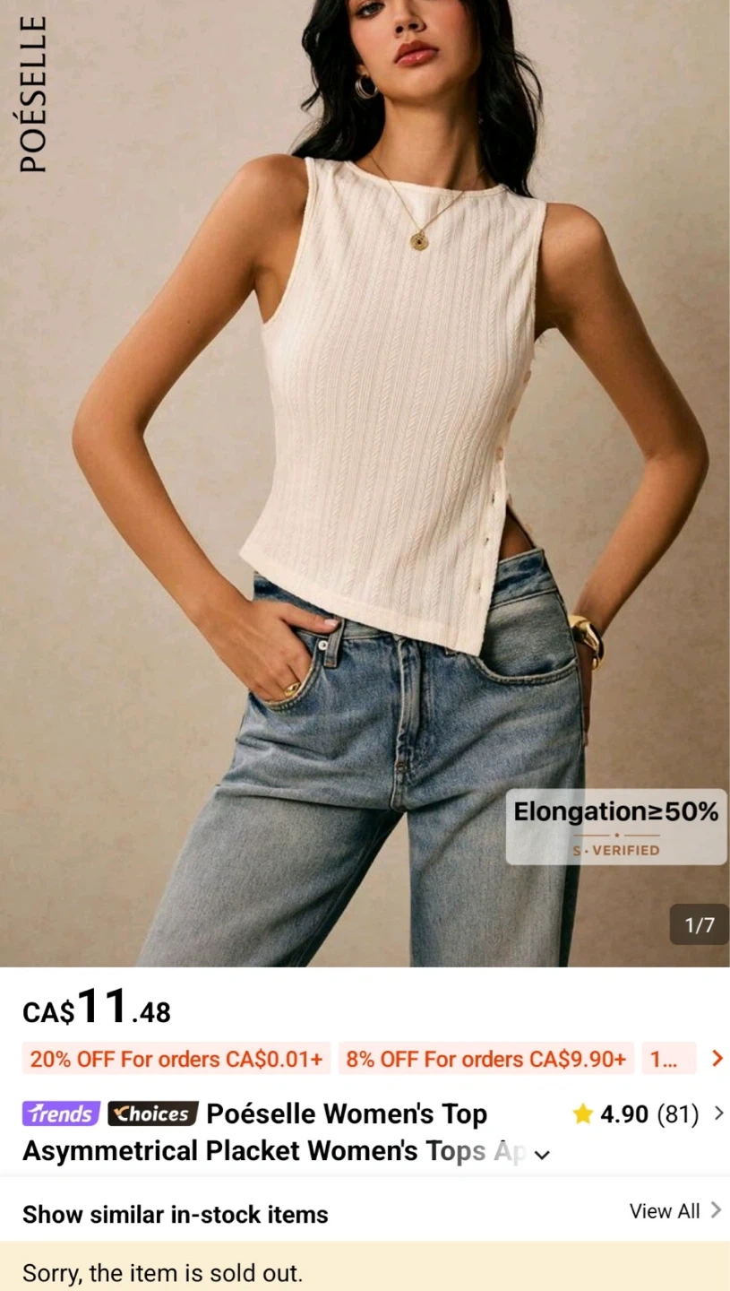 This cream Poéselle top features an asymmetrical placket with button details. It's a sleeveless design with a ribbed knit texture. It's suitable for casual wear.