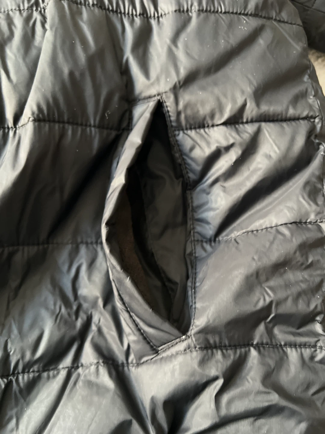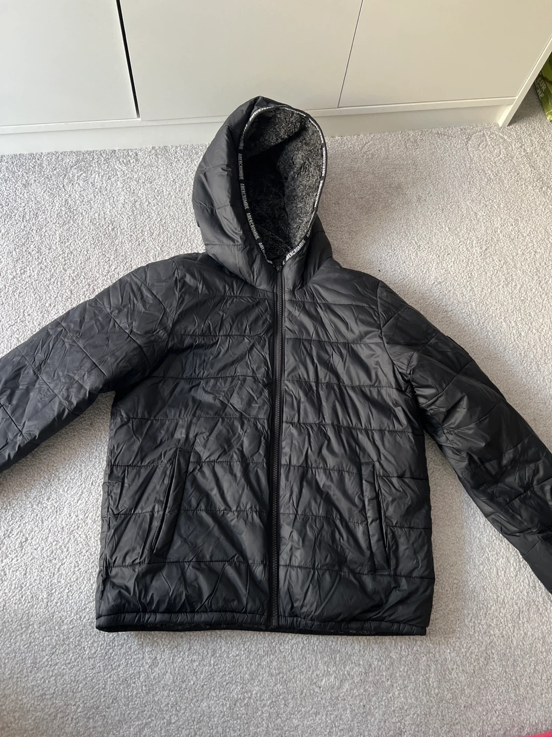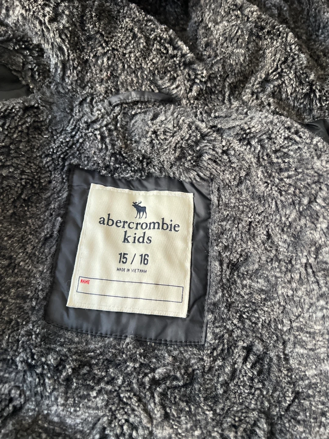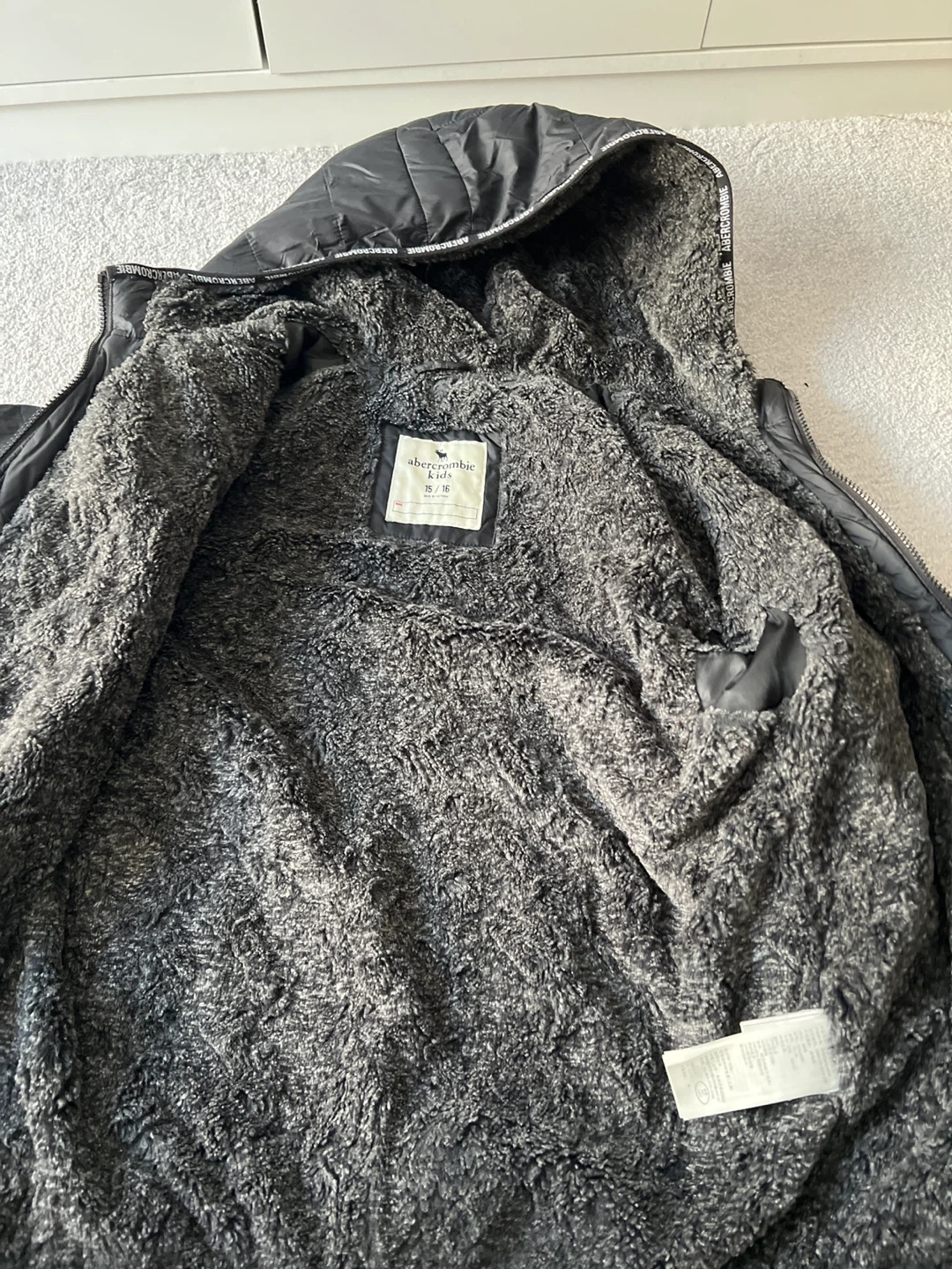 Black puffer winter jacket from Abercrombie Kids. It's fully lined with soft grey faux fur for extra warmth. Made in Vietnam. Size 15/16.